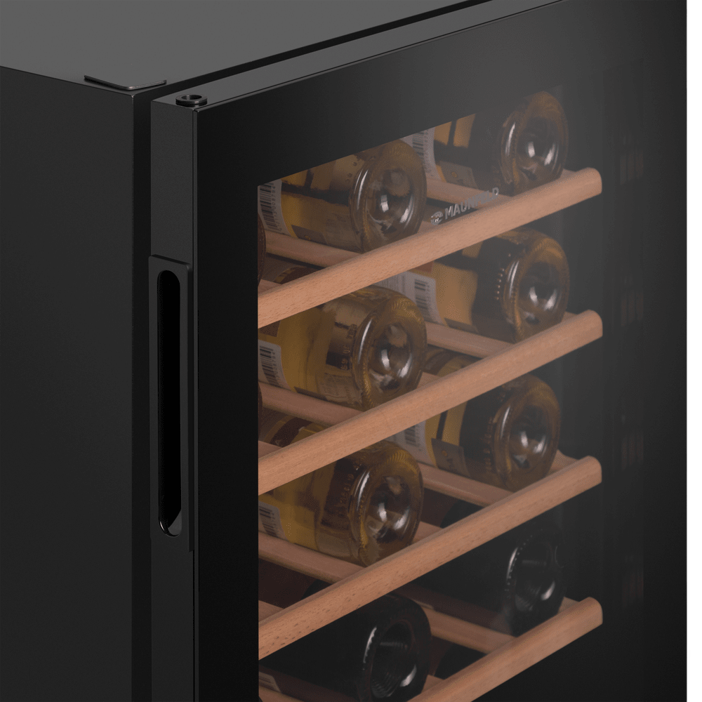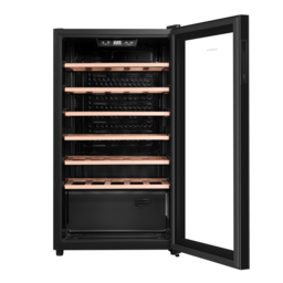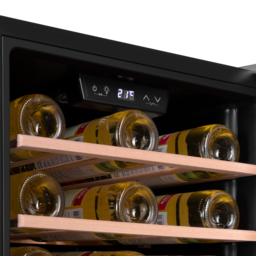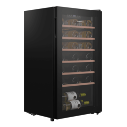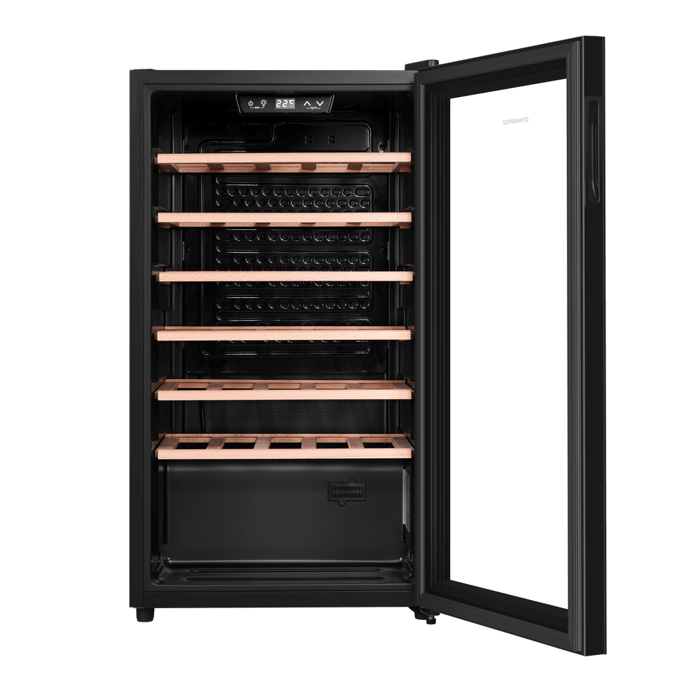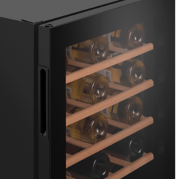 Стеклянная дверь — дополнительный изящный штрих к общему дизайну модели. Специальное покрытие защищает вино от влияния ультрафиолетовых лучей, которые проникают, если шкаф находится в солнечной комнате. Цвет корпуса — черный.