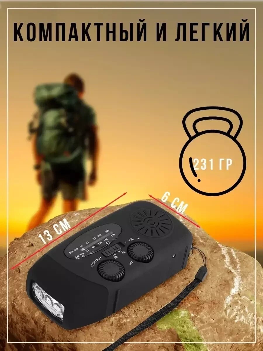 Фонарь динамо GVD с солнечной батареей и радио 2000 мАч / ручная зарядка для телефона / кемпинговый (чёрный)