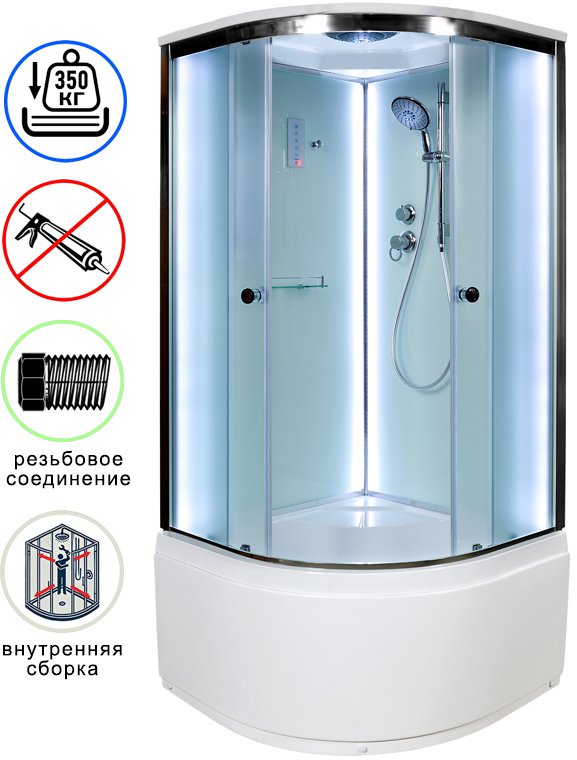 Стильная душевая кабина с внутренней сборкой AvaCan D511S LED сочетает в себе высокую функциональность, практичность и надежность. Для изготовления применяют безопасное закаленное стекло толщиной 4 мм, надежно фиксируемое алюминиевым профилем. Цвет профиля хром. В комплекте встроенное сидение, сифон, полочка, зеркало, сенсорный пульт управления, смеситель, переключатель режимов, передний съемный экран, донный клапан (клик-клак), душевой гарнитур, тропический (верхний) душ, вентиляция, радио.