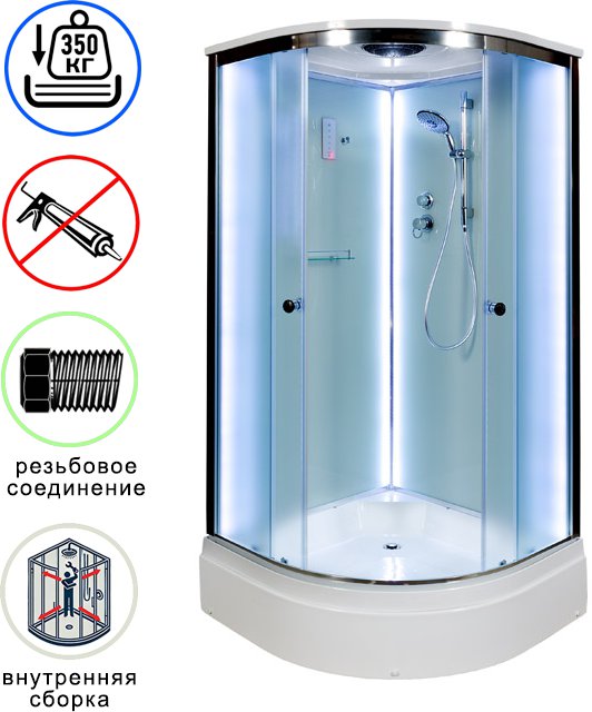 Стильная душевая кабина AvaCan D271S LED сочетает в себе высокую функциональность, практичность и надежность. Для изготовления применяют безопасное закаленное стекло толщиной 4 мм, надежно фиксируемое алюминиевым профилем. Цвет профиля хром. В комплекте сифон, полочка, зеркало, сенсорный пульт управления, смеситель, переключатель режимов, душевой гарнитур, тропический (верхний) душ, вентиляция, радио.