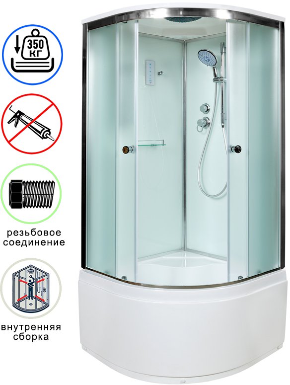 Стильная душевая кабина AvaCan D10S с электрикой сочетает в себе высокую функциональность, практичность и надежность. Для изготовления применяют безопасное закаленное стекло толщиной 4 мм, надежно фиксируемое алюминиевым профилем. Цвет профиля хром. В комплекте встроенное сидение, сифон, полочка, сенсорный пульт управления, смеситель, переключатель режимов, передний съемный экран, душевой гарнитур, тропический (верхний) душ, вентиляция, радио.