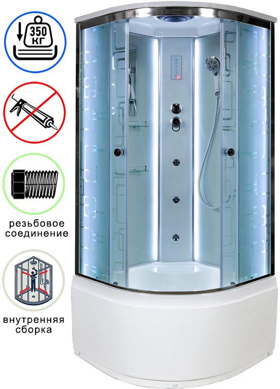 Стильная душевая кабина с внутренней сборкой AvaCan EM4510 LED с гидромассажем сочетает в себе высокую функциональность, практичность и надежность. Для изготовления применяют безопасное закаленное стекло толщиной 5 мм, надежно фиксируемое алюминиевым профилем. Цвет профиля хром. В комплекте led-подсветка, вентиляция, донный клапан (клик-клак), душевой гарнитур, зеркало, переключатель режимов, полочки, радио, сенсорный пульт управления, смеситель, тропический (верхний) душ.