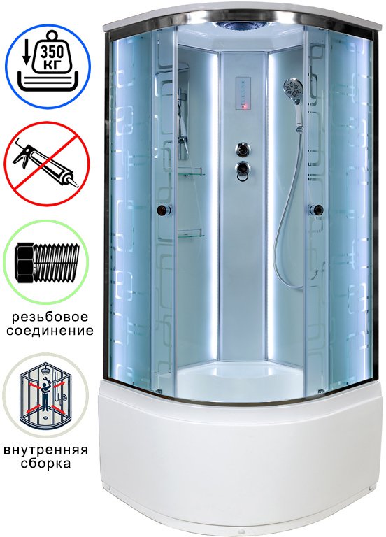 Стильная душевая кабина AvaCan EM4580 LED сочетает в себе высокую функциональность, практичность и надежность. Для изготовления применяют безопасное закаленное стекло толщиной 5 мм, надежно фиксируемое алюминиевым профилем. Цвет профиля хром. В комплекте зеркало, донный клапан (клик-клак), душевой гарнитур, переключатель режимов, смеситель, тропический (верхний) душ, полочки, тропический (верхний) душ.
