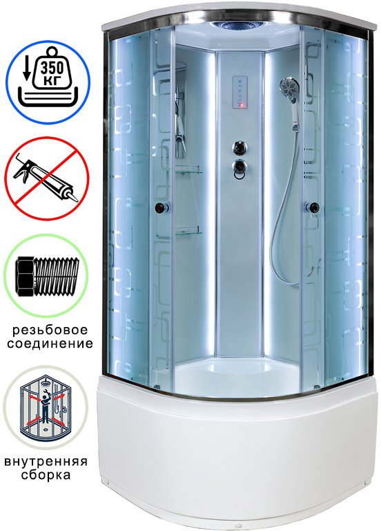 Стильная душевая кабина AvaCan EM4590 LED сочетает в себе высокую функциональность, практичность и надежность. Для изготовления применяют безопасное закаленное стекло толщиной 5 мм, надежно фиксируемое алюминиевым профилем. Цвет профиля хром. В комплекте зеркало, донный клапан (клик-клак), душевой гарнитур, полочки.