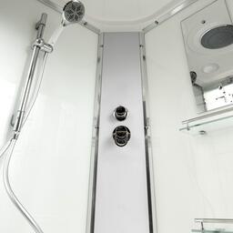 Стильная душевая кабина с внутренней сборкойAvaCan EM 5012 L сочетает в себе высокую функциональность, практичность и надежность. Для изготовления применяют безопасное закаленное стекло толщиной 5 мм, надежно фиксируемое алюминиевым профилем. Цвет профиля хром. В комплекте зеркало, донный клапан (клик-клак), переключатель режимов, смеситель, тропический (верхний) душ, полочки, сифон.