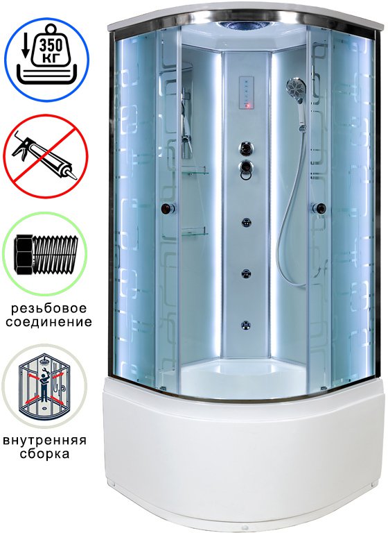 Стильная душевая кабина AvaCan EM4580 LED с гидромассажем сочетает в себе высокую функциональность, практичность и надежность. Для изготовления применяют безопасное закаленное стекло толщиной 5 мм, надежно фиксируемое алюминиевым профилем. Цвет профиля хром. В комплекте зеркало, донный клапан (клик-клак), переключатель режимов, смеситель, тропический (верхний) душ, полочки, тропический (верхний) душ, вентиляция, радио