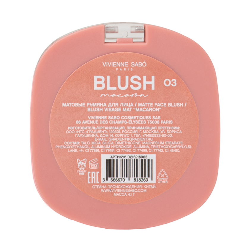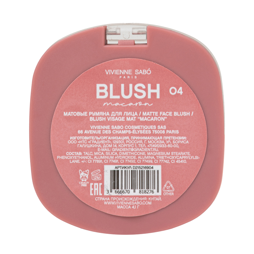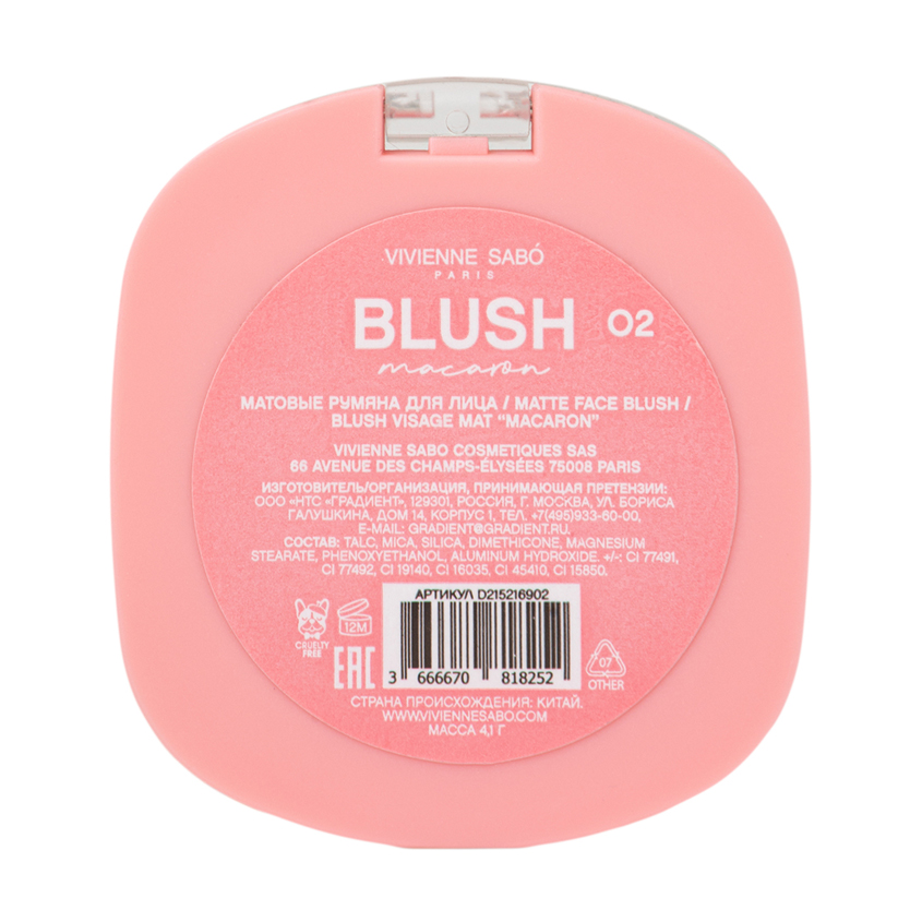 Румяна для лица `VIVIENNE SABO` MACARON матовые тон 04 Натурально-розовый