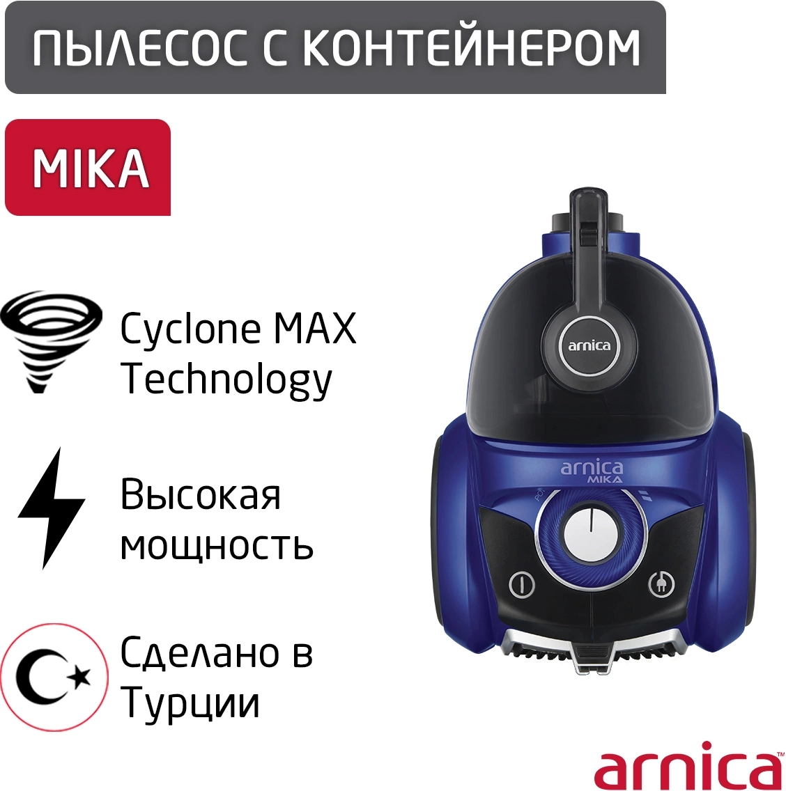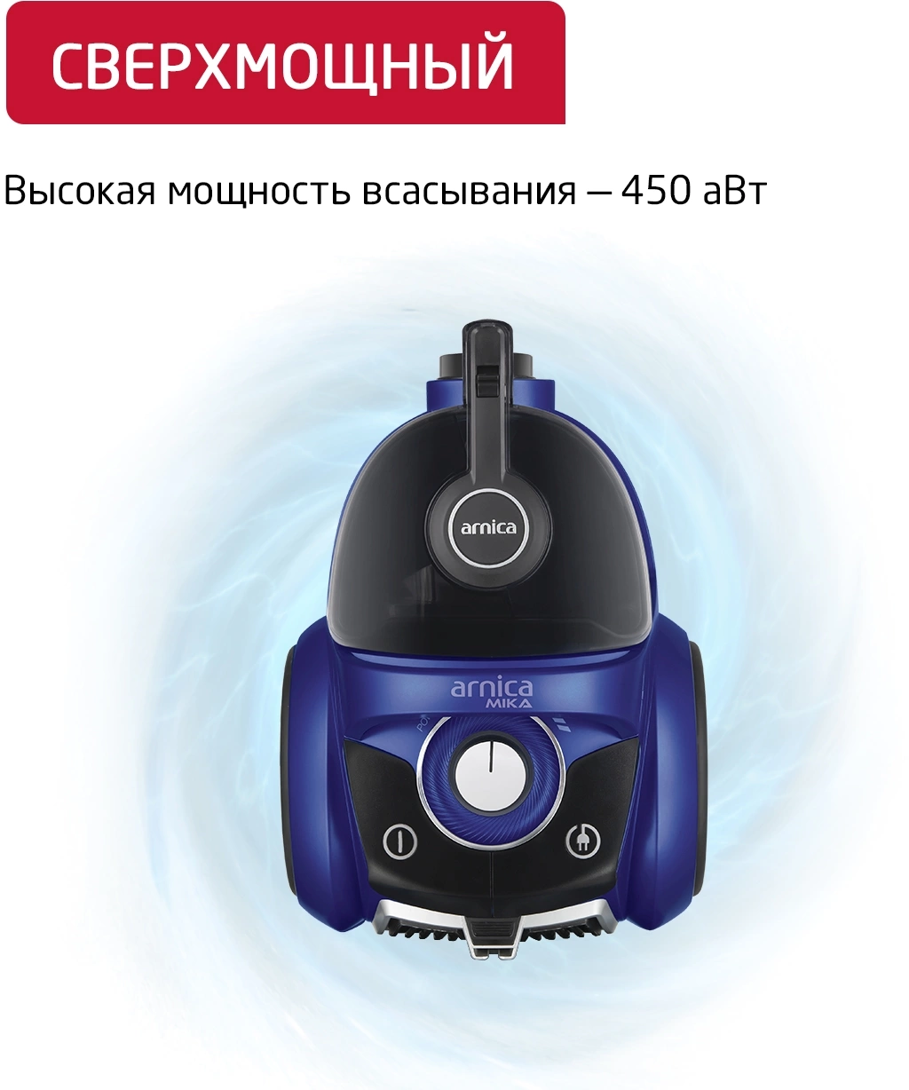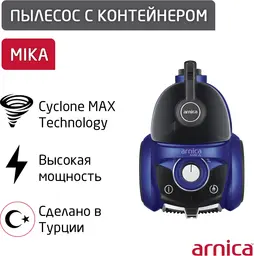 ОписаниеПылесос ARNICA Mika ? надежный прибор для сухой уборки. Обладая мощностью 2000 Вт, он легко справляется с уборкой мелкой пыли и крупного мусора. ARNICA Mika эффективно очищает воздух благодаря технологии фильтрации Cyclone MAX и моющемуся фильтру в контейнере.