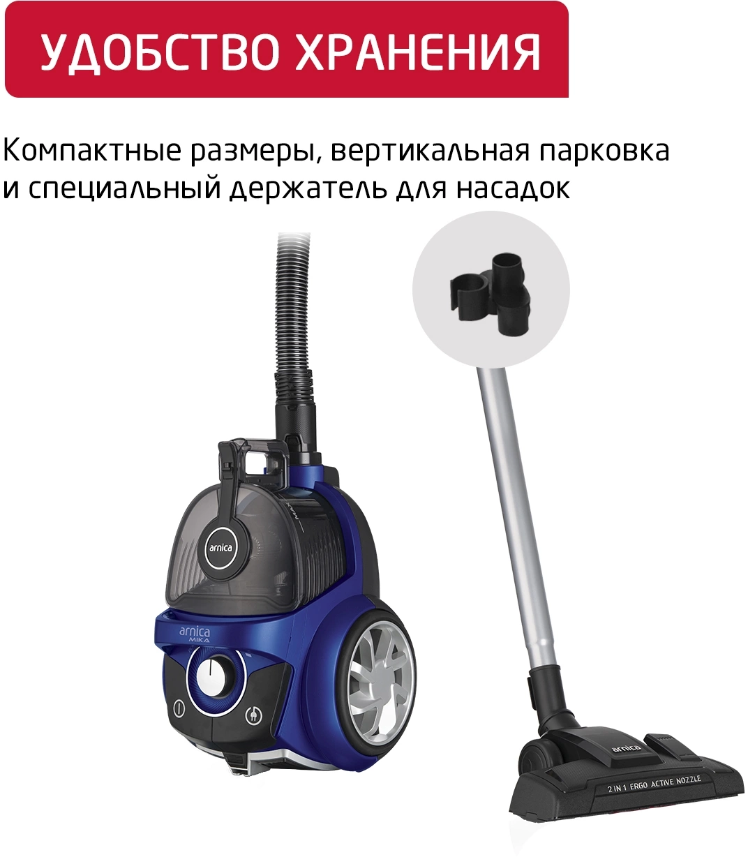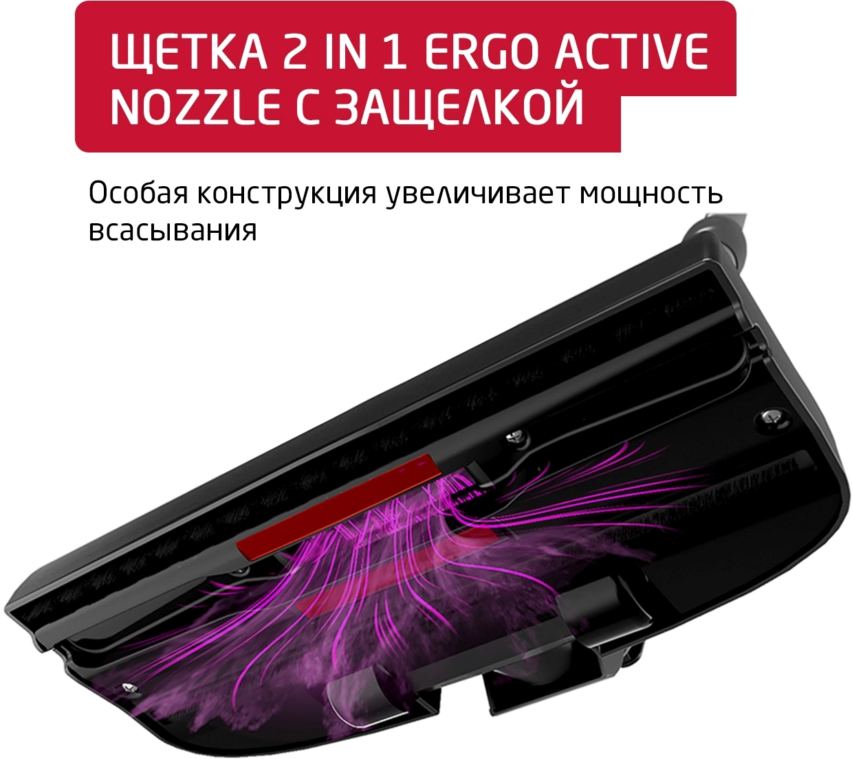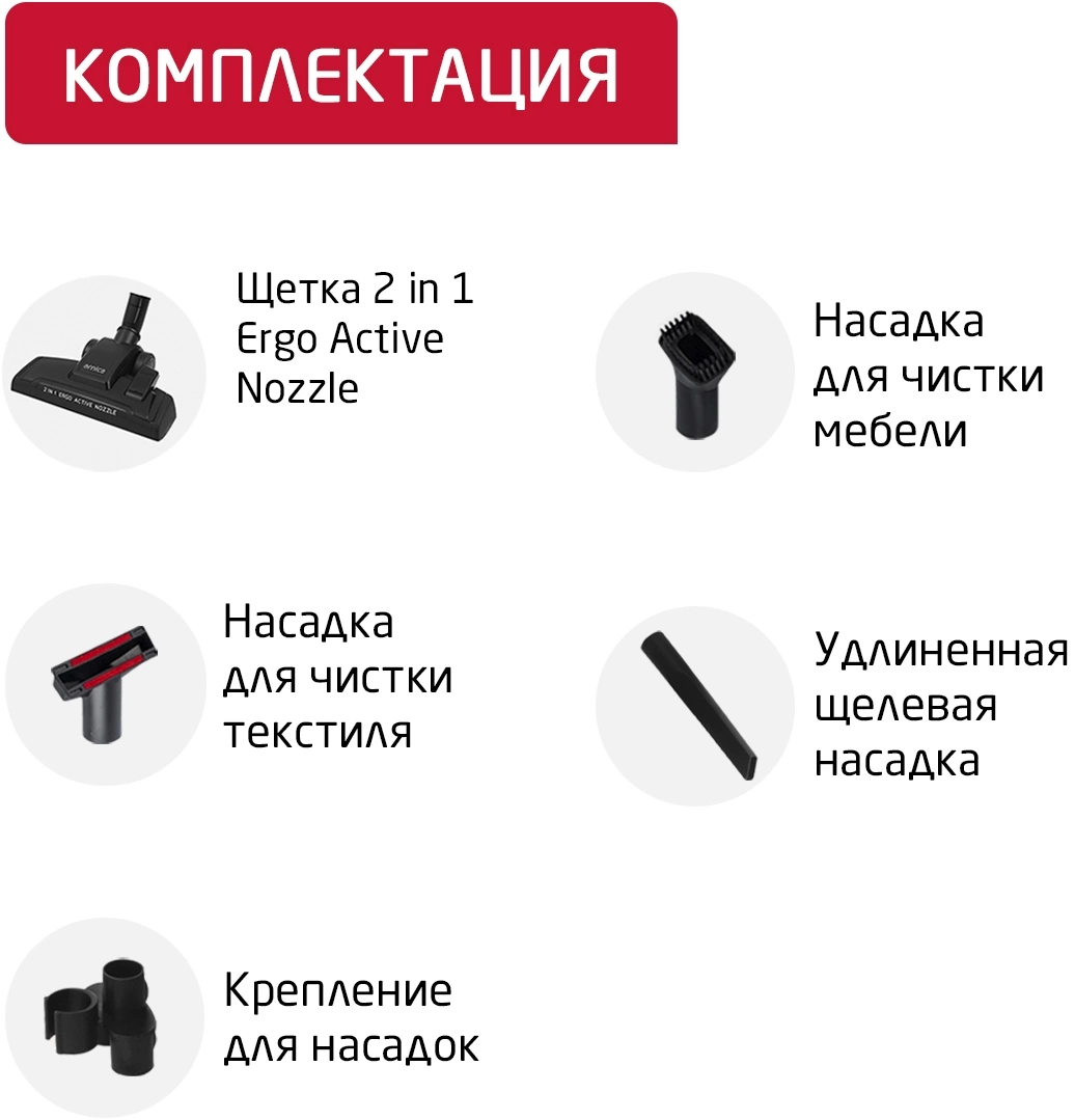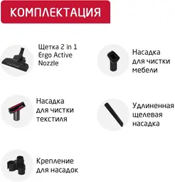 Насадки в комплектенасадка 2 in 1 Ergo Active Nozzle, удлиненная щелевая насадка, насадка для чистки текстиля и тканевых обивок мебели(прямоугольная), круглая насадка для мебели с мягким ворсом