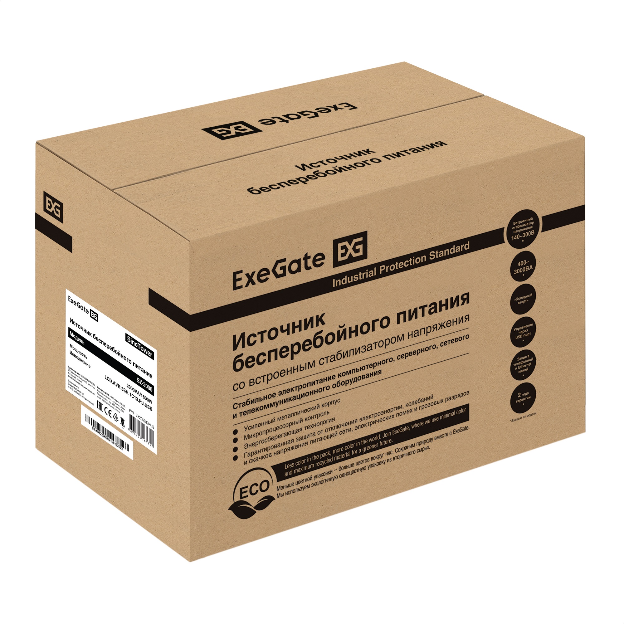 Повр. упаковка. ИБП (инвертор, синус, для котла) ExeGate SineTower SZ-2000.LCD.AVR.3SH.1C13.USB (2000VA/1600W, чистая синусоида, LCD дисплей, AVR, 3*Schuko+1*C13, USB, линейно-интерактивный, внешняя батарея 24В до 250Ач (поставляется отдельно), Black)