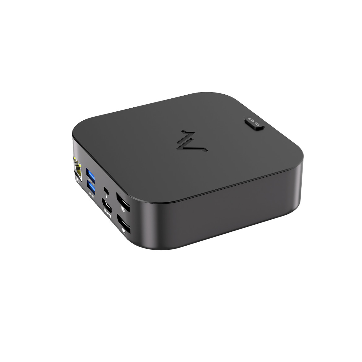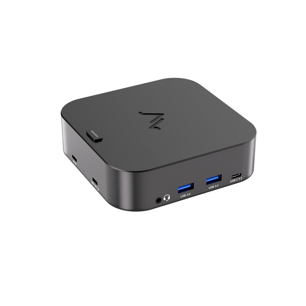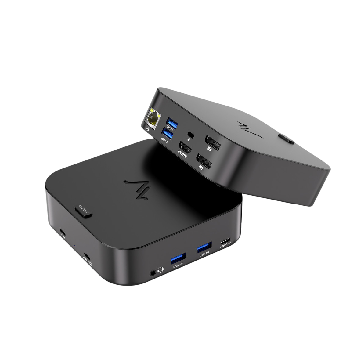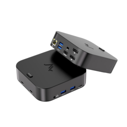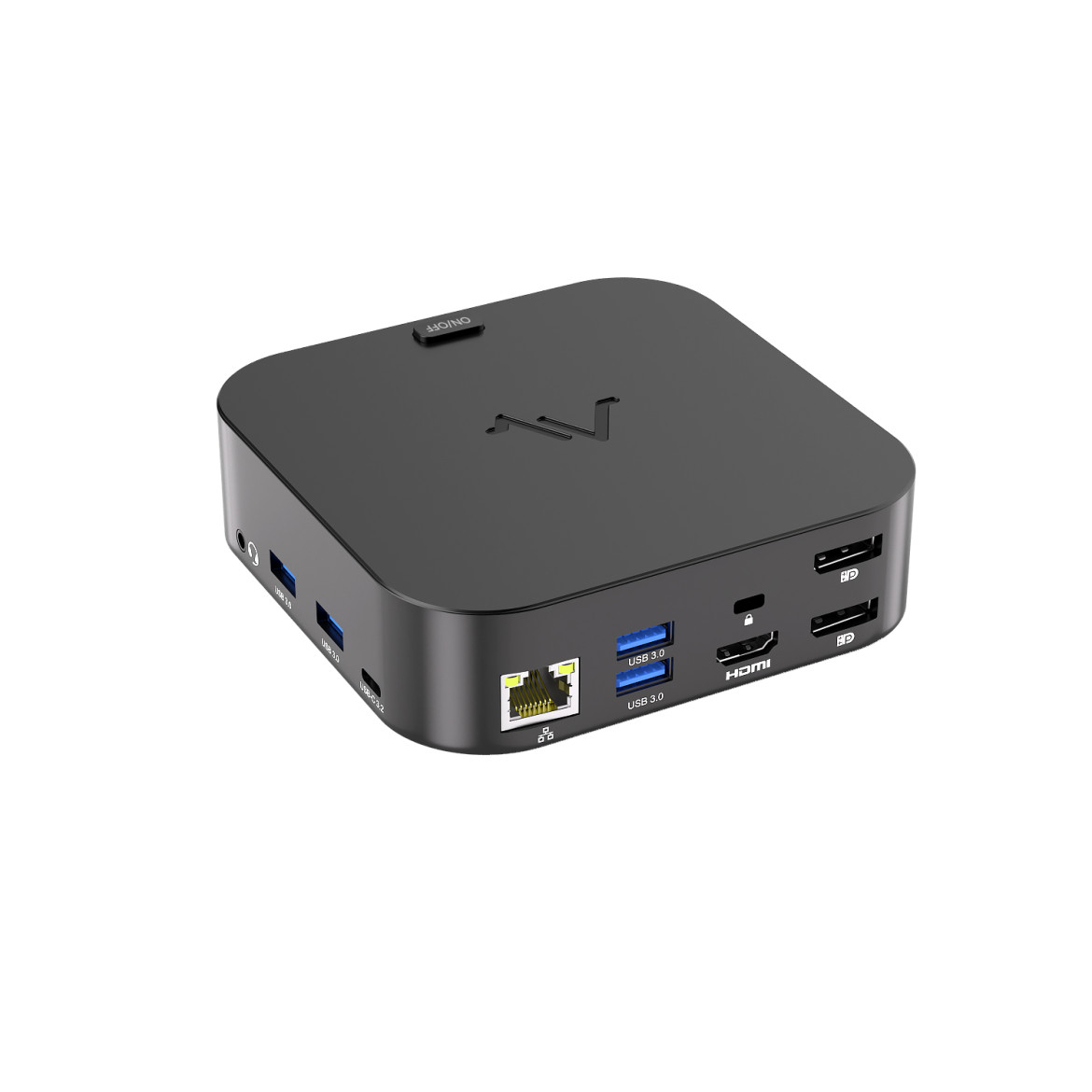 Устройство оснащено широким набором интерфейсов: вход USB-C с поддержкой Power Delivery до 100 Вт, 4 порта USB 3.0 для подключения периферийных устройств, аудиоразъём 3,5 мм, порт RJ45 для стабильного проводного интернета, а также HDMI и два DisplayPort для подключения до трёх внешних мониторов.