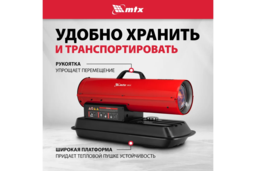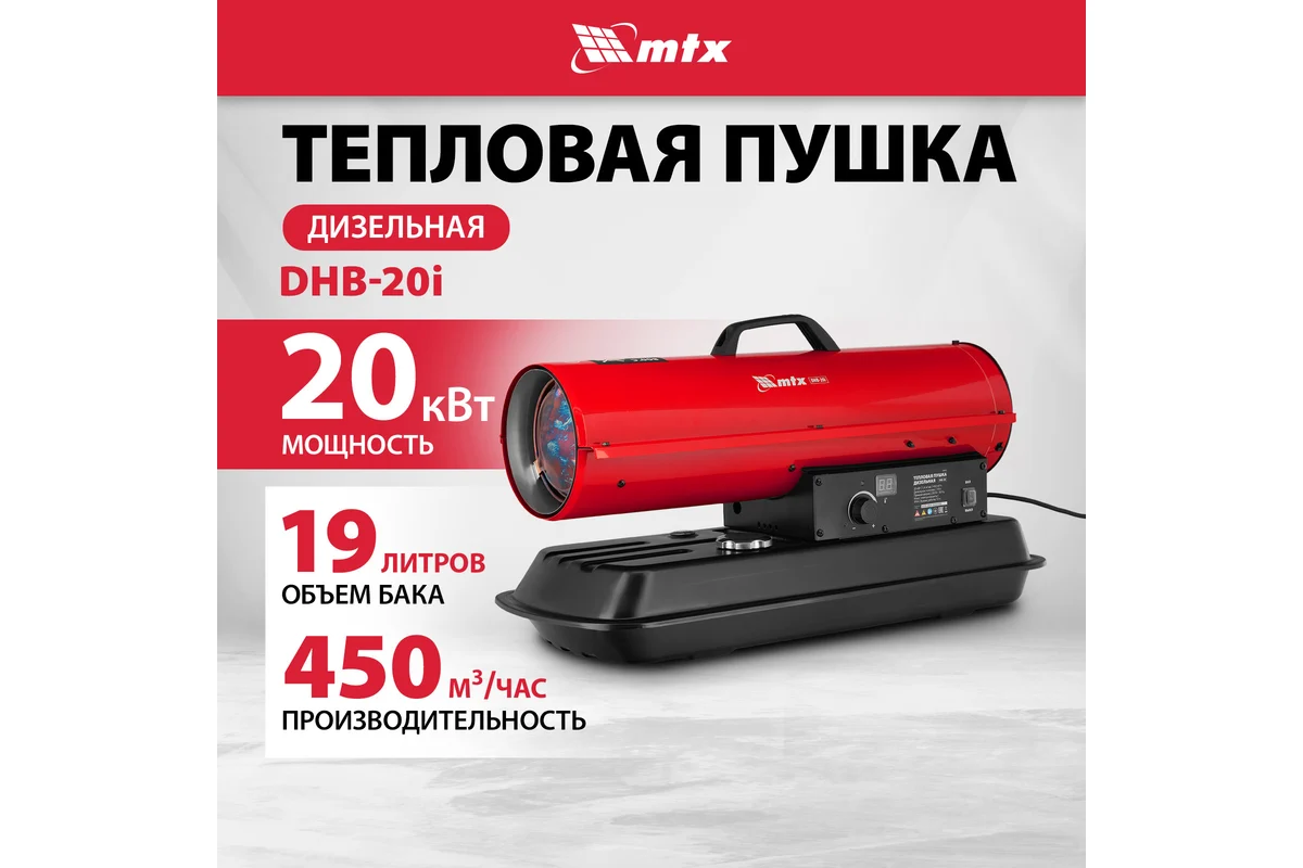 Дизельная тепловая пушка MTX DHB-20i тепловой мощностью 20 кВт и производительностью 450 м3/ч, с прямым типом нагрева и термостатом, предназначена для обогрева складов, цехов, теплиц и других нежилых помещений. Также используется на производстве и в строительстве: для прогрева бетона, просушки стен и разморозки траншей. Важно: в обогреваемом помещении необходимо обеспечить хорошую вентиляцию!