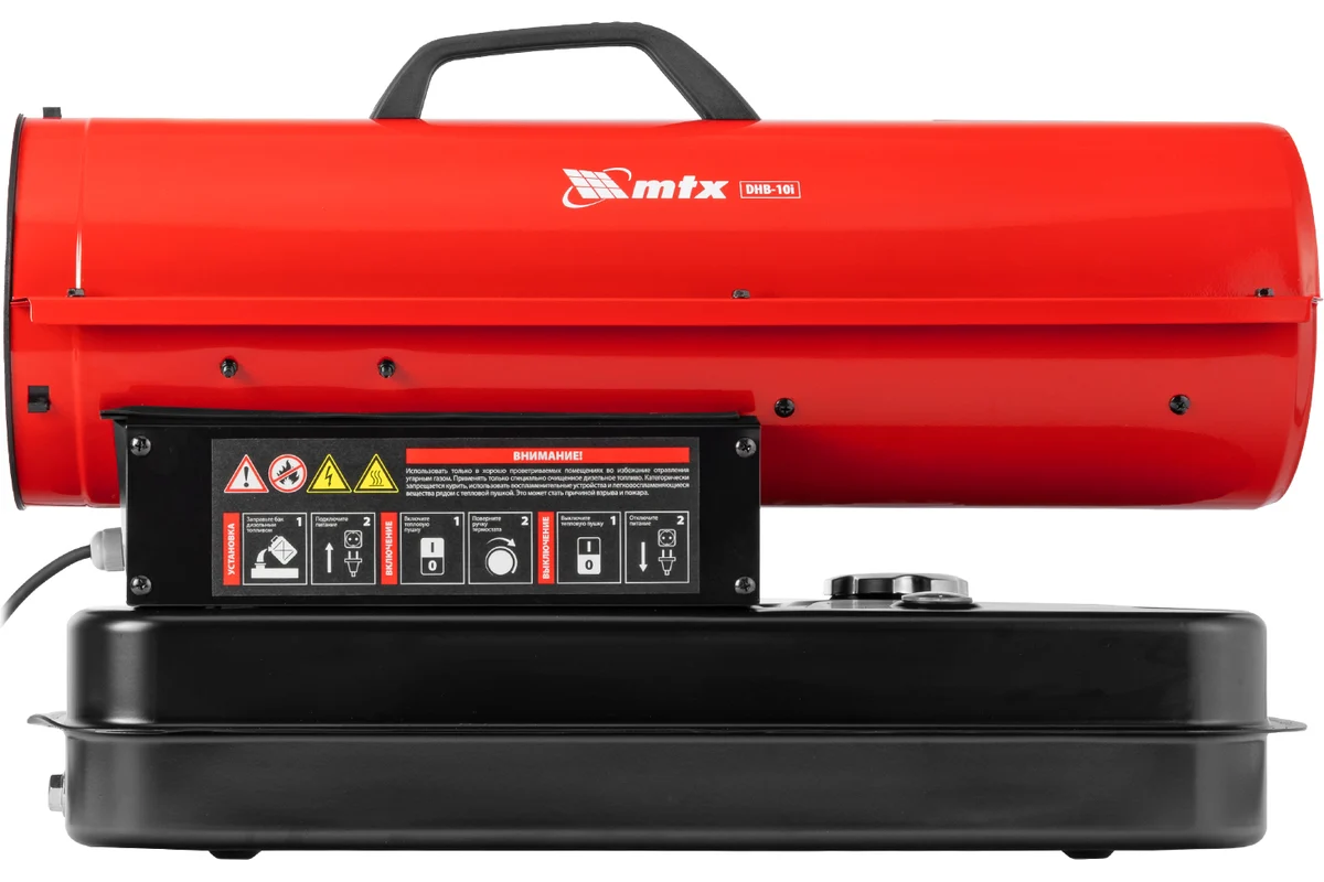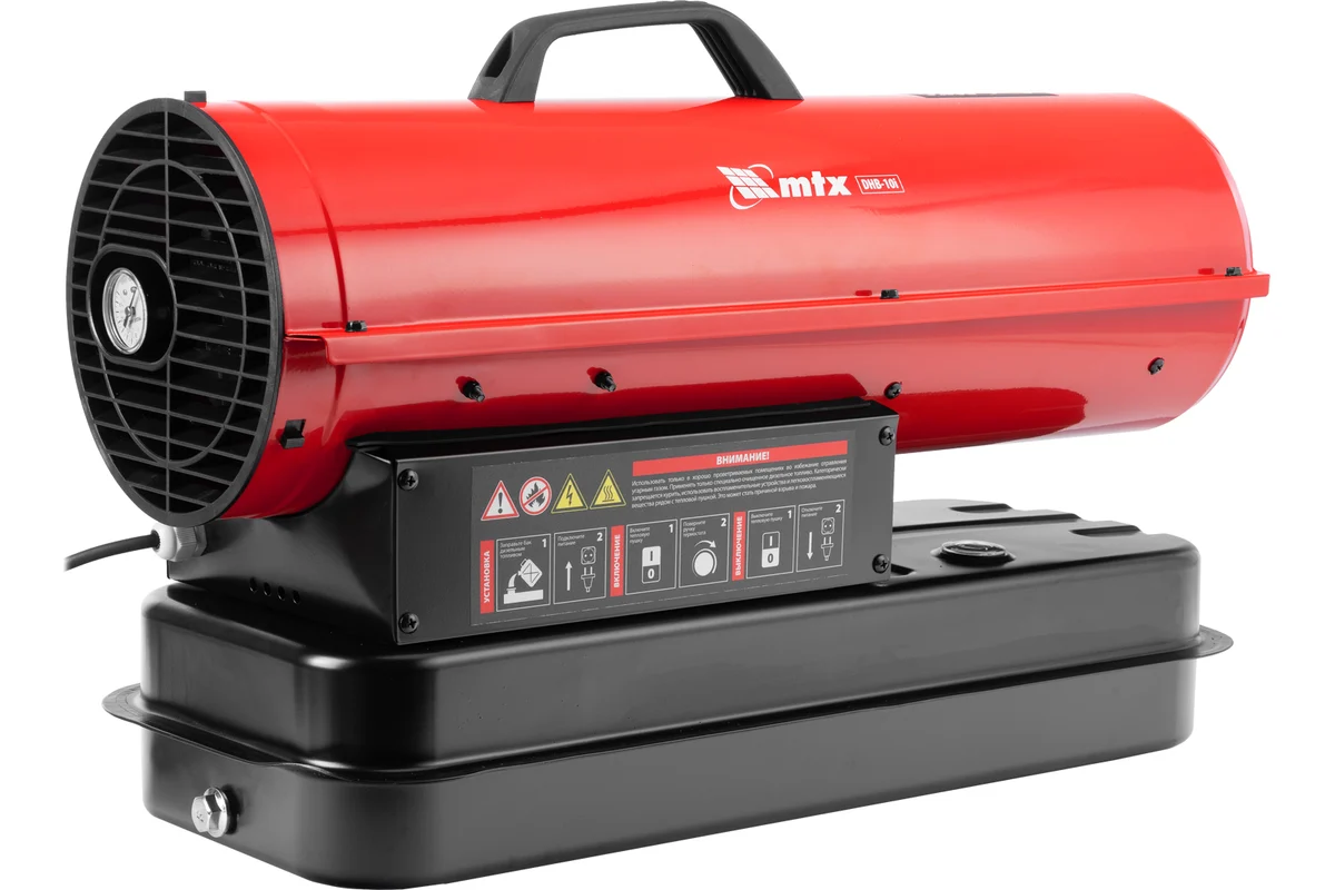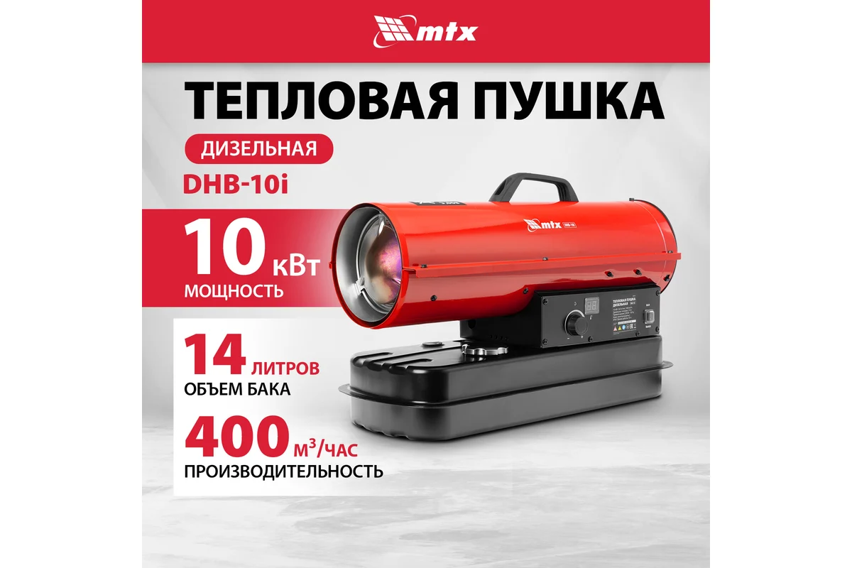 Дизельная тепловая пушка MTX DHB-10i тепловой мощностью 10 кВт и производительностью 400 м3/ч, с прямым типом нагрева и термостатом, предназначена для обогрева складов, цехов, теплиц и других нежилых помещений. Также используется на производстве и в строительстве: для прогрева бетона, просушки стен и разморозки траншей. Важно: в обогреваемом помещении необходимо обеспечить хорошую вентиляцию!