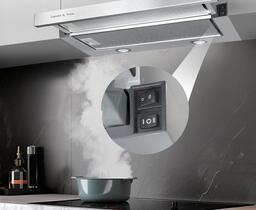 Вытяжка работает в режимах отвода и циркуляции, поэтому загрязнения удаляются из комнаты и перенаправляются в воздуховод, при этом можно очистить воздух и использовать повторно за счет возвращения его в помещение. Количество скоростей в этой модели: 2 шт. При этом максимальная производительность составляет 700 куб.м./ч. Уровень шума при полной загруженности — 51 дБ.