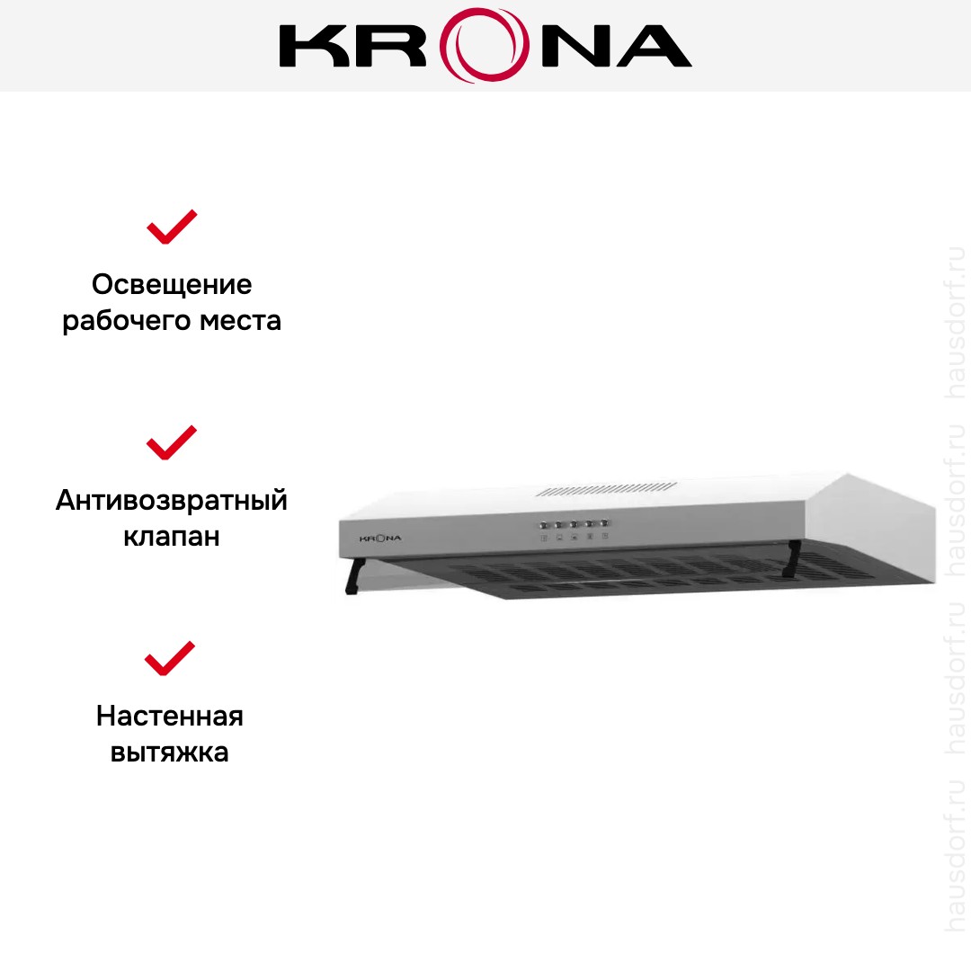 Крепление вытяжки к стене — стандартное для многих моделей, ими удобно управлять, так как кнопки находятся на расстоянии вытянутой руки. Обратите внимание на цветовые сочетания модели KRONA OSTEN 600 white PB, чтобы органично вписать ее в свою квартиру. Оттенок корпуса: белый. Благодаря лампочкам, которые расположены на нем, можно освещать плиту и столешницу рядом, чтобы готовить было еще проще и приятнее.