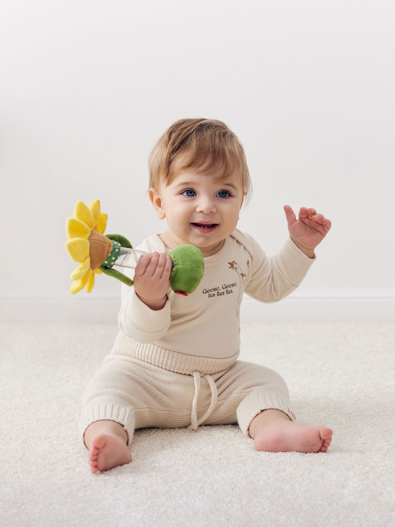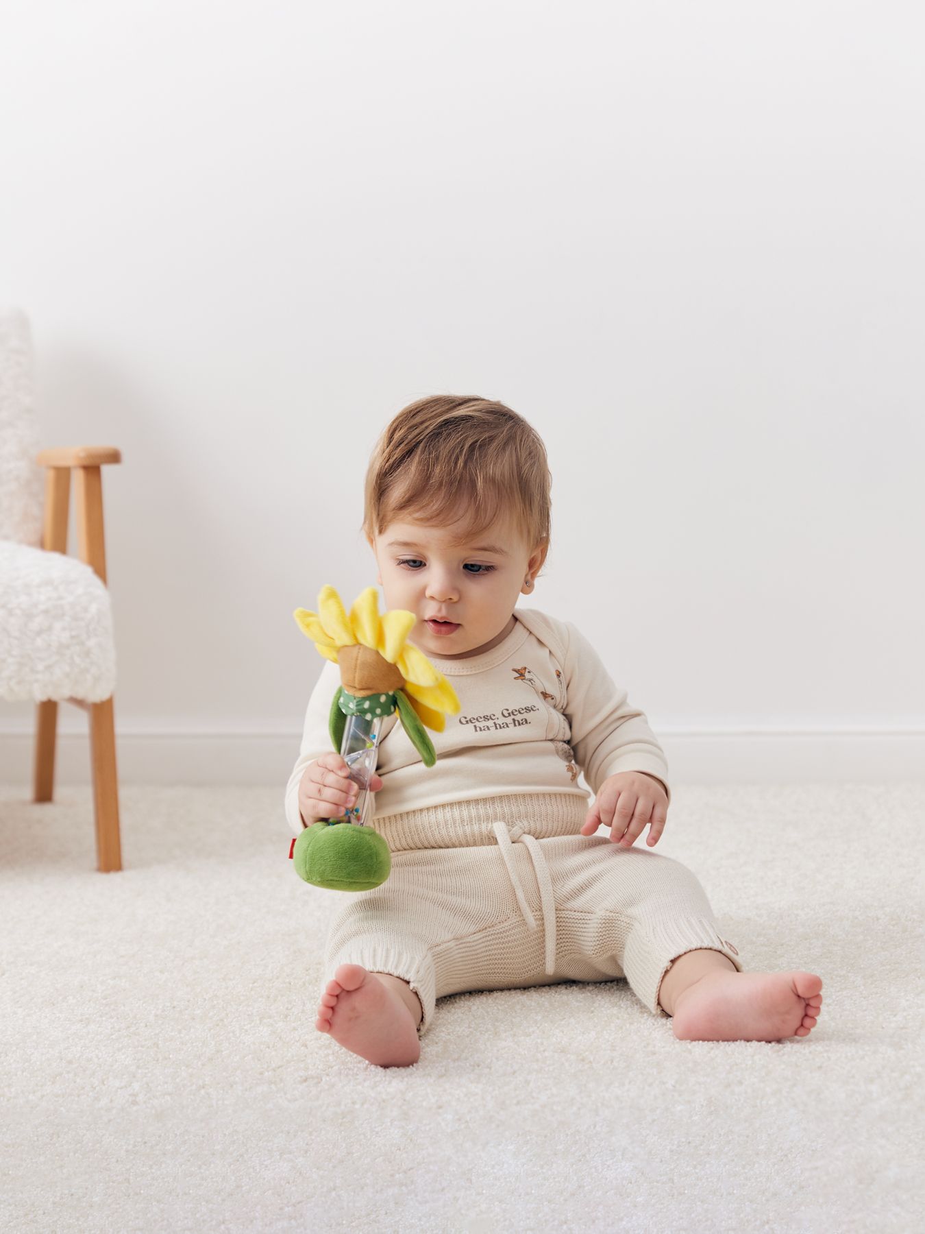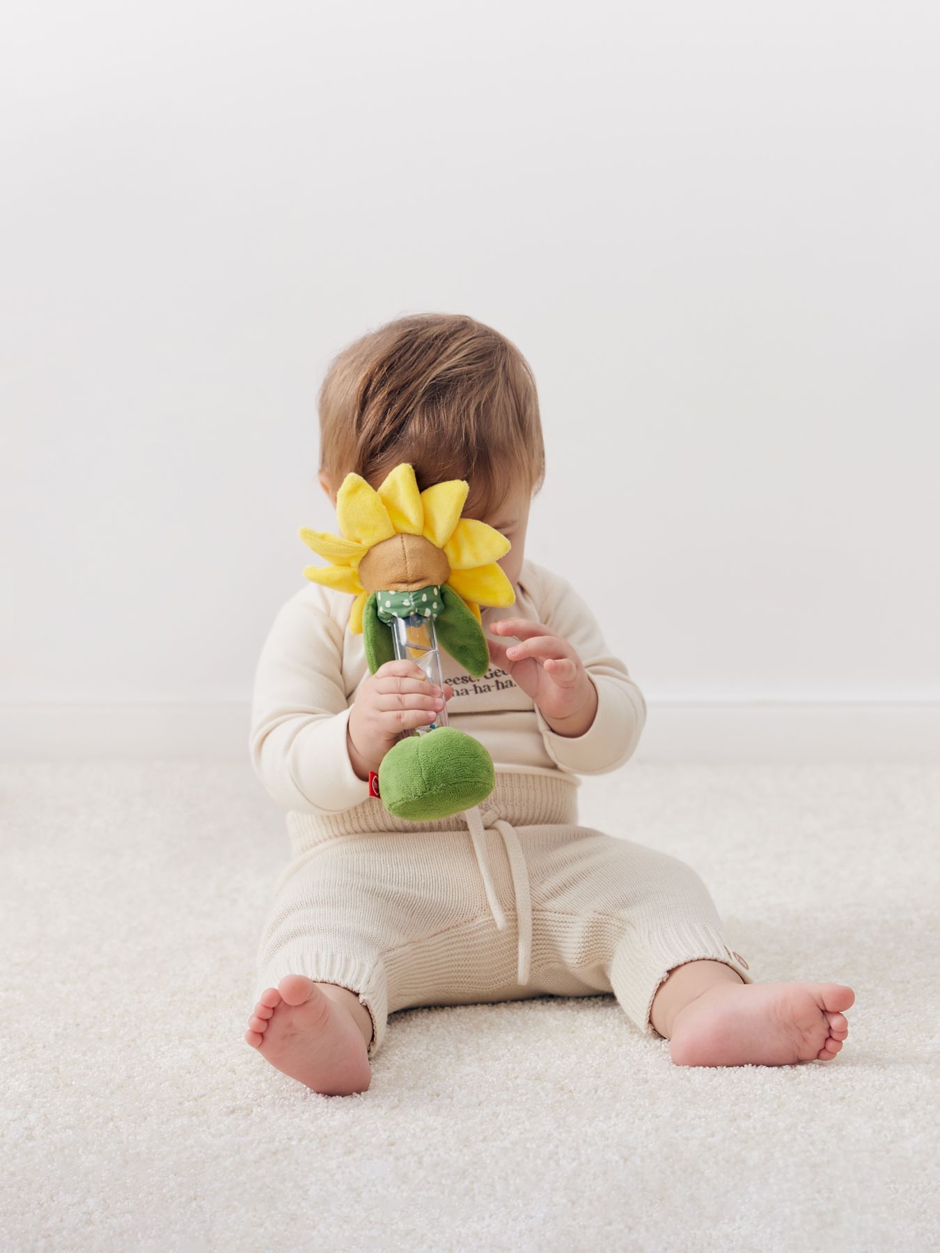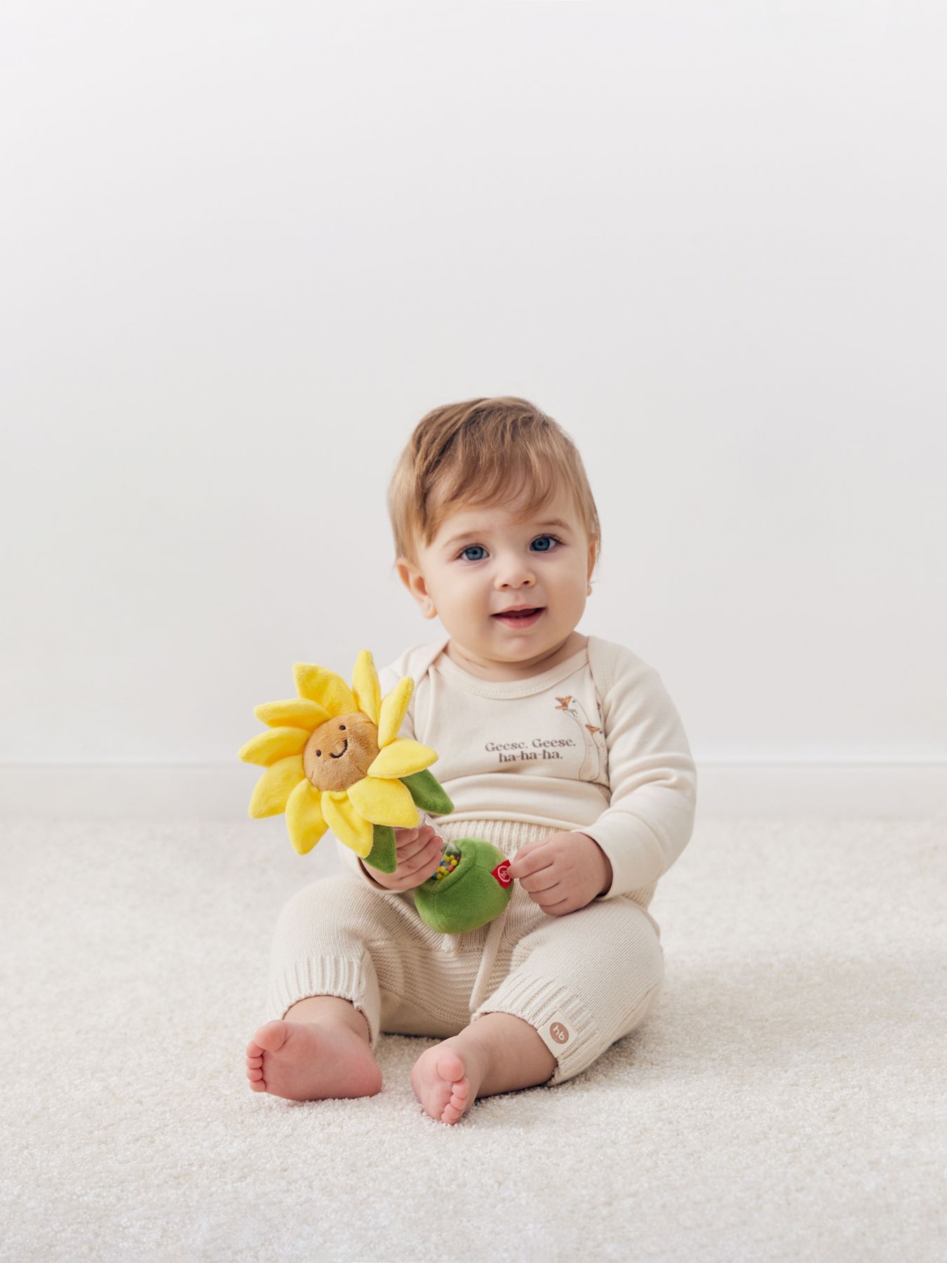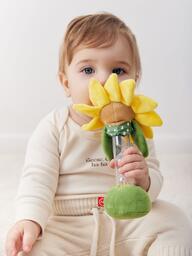 Подсолнух идеально подходит для самых маленьких. Лёгкую погремушку с узким основанием удобно держать в ладошках, тренируя хватательный рефлекс, координацию. Мягкие лепестки имеют шуршащий эффект. Яркие контрастные цвета привлекут ребёнка, помогут тренировать цветовое восприятие. Игрушку можно наклонять и наблюдать за движением разноцветных шариков. Игра развивает внимание, логику и память, зрение.