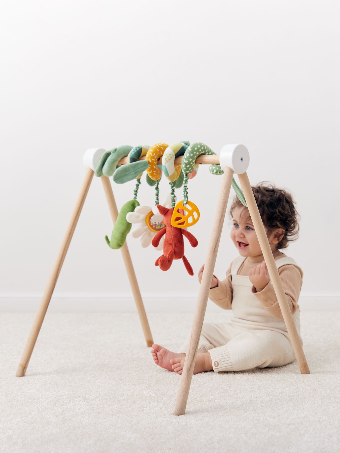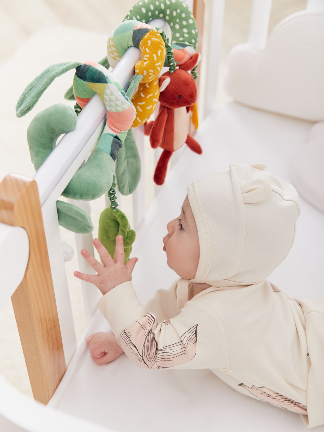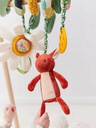 Игрушка-спираль – настоящий развивающий центр. Мягкая, необычной формы, сжимается и разжимается – малышу будет интересно познавать её свойства, различать на ощупь разнообразие материалов, рассматривать цвет и фактуру тканей, из которых она изготовлена. Подвески в виде лисички и горошка с добрыми мордочками станут верными друзьями ребёнка. Наблюдение за подвижными частями поможет научиться удерживать взгляд на предмете. Листочек с отверстиями приятно трогать и грызть. Спираль легко подвесить на коляску, в кроватку или автомобиль. Игрушка прочная и гибкая, легко поддаётся малышу, когда он тянет её к себе и возвращается в исходное положение, когда отпускает.