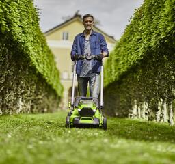 Газонокосилка имеет привод на задние колёса. Длительная непрерывная работа обеспечивается функцией Switchover. В батарейный отсек устанавливаются сразу два аккумулятора. После разрядки первого происходит автоматическое переключение на второй. Но, в то же время, установка сразу 2-х батарей не обязательна.