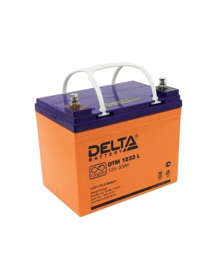 Герметизированный VRLA cвинцово-кислотный аккумулятор Delta DTM 1233 L напряжением 12В и емкостью 33Ач изготовлен по технологии AGM (с микропористым заполнителем, пропитанным электролитом). Корпус изготовлен из негорючего ABS пластика. Срок службы аккумулятора достигает 12 лет. Аккумулятор предназначен для работы в режиме постоянного подзаряда (буферный режим) или в режиме разряд-заряд (циклический режим). Обладает низким внутренним сопротивлением и саморазрядом.