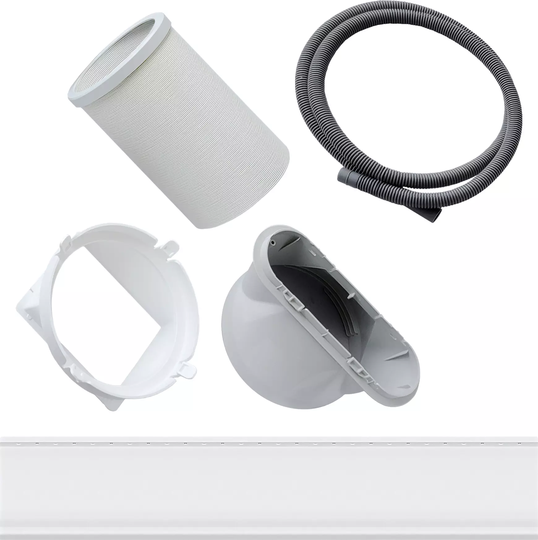 • Дополнительная комплектация 1. Впускное крепление на шланг, 1 шт. 2. Воздуховодный шланг, 1 шт. 3. Выпускное крепление на шланг, 1 шт. 4. Оконный слайдер под выпускное крепление, 1 шт. 5. Пульт дистанционного управления и батарейки, 1 и 2 шт. 6. Дренажный шланг, 1 шт