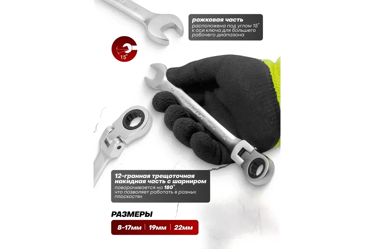 • Вид ключа/насадки накидной трещоточный, рожковый