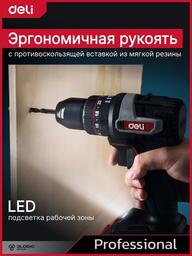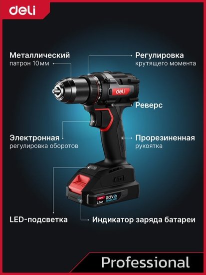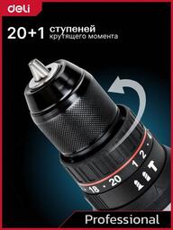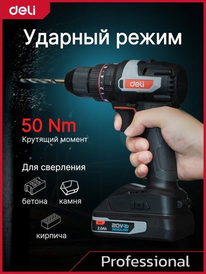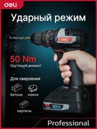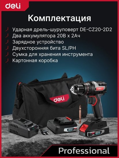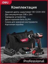 • Комплектация - Дрель-шуруповерт Deli DE-CZ20-1D2- АКБ 20В х 2Ач - 2шт- Зарядное устройство- Двухсторонняя бита SL/PH- Инструкция/гарантийный талон- Сумка для хранения- Коробка