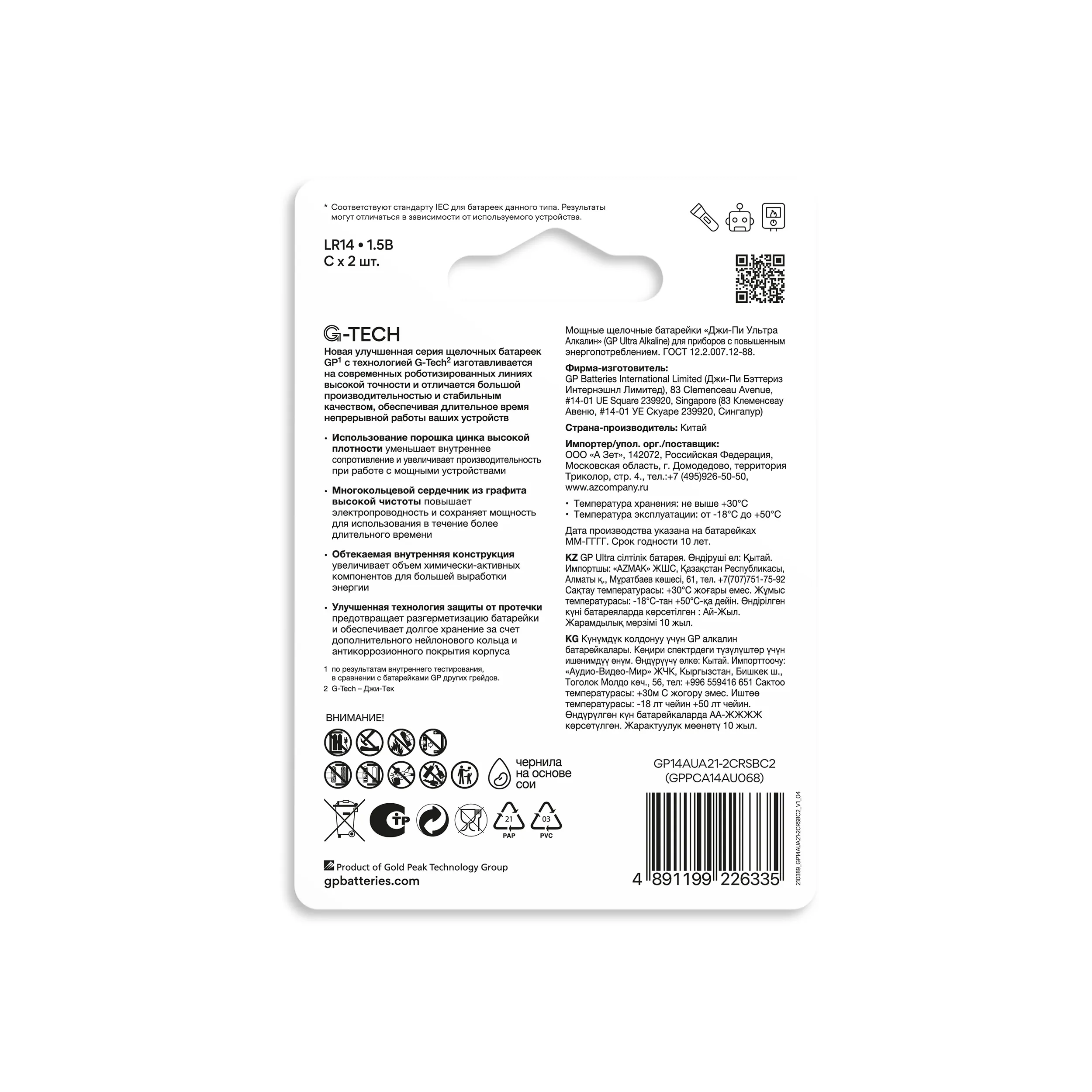 Алкалиновые батарейки GP Ultra Alkaline G-Tech 14А типоразмера C - 2 шт. на блистере