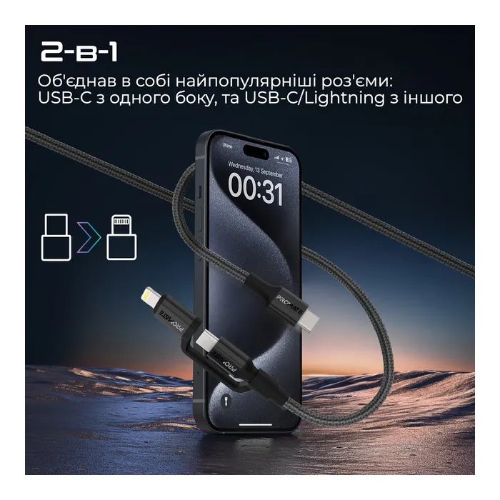 Дата кабель USB-C to USB-C + Lightning black Promate (powerlink-cci.black)