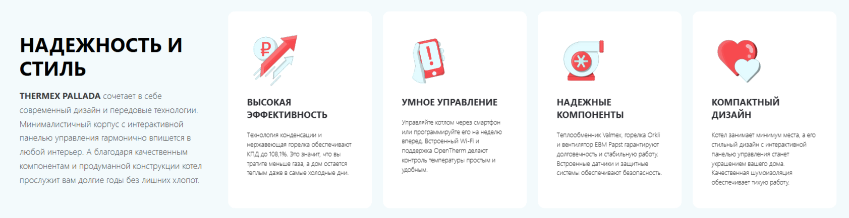 • Защита газ-контроль, от замерзания, от перепада напряжения, от перегрева, от потери давления