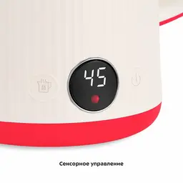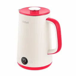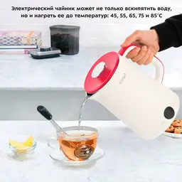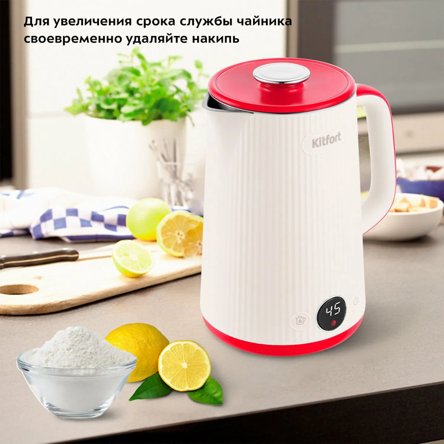 Электрический чайник с электронным терморегулятором Kitfort КТ-6197 может не только вскипятить воду, но и нагреть её до температур: 45, 55, 65, 75 и 85°С. Ручка чайника пластиковая, не нагревается и удобно лежит в руке. Ёмкость чайника 1.7 л. Кнопка «Вкл/Выкл» включает и выключает чайник. Кнопка «Поддержание температуры» циклически переключает температуру для поддержания 45, 55, 65, 75, 85 °С. На дисплее отображается текущая температура воды в чайнике. Корпус чайника и крышка выполнены из пластика, а внутренняя колба чайника и внутренняя часть крышки изготовлены из нержавеющей стали. Съёмная крышка и большое горлышко чайника облегчают доступ внутрь при его мойке и во время удаления накипи. Полный чайник закипает за 6–7 минут. При закипании чайник автоматически отключится. Прибор имеет защиту от перегрева и от включения без воды: при включении без воды чайник нагревается и отключается (срабатывает защита от перегрева). Подставка с центральным контактом дает возможность располагать на ней чайник в любом положении, обеспечивая вращение на 360°. Снизу имеется отсек для хранения шнура, в который можно смотать излишки шнура электропитания, чтобы он не мешал на столе. Для увеличения срока службы чайника своевременно удаляйте накипь. Поместите в чайник специальное средство, залейте 0.5 л воды и доведите до кипения. После вскипятите в нем воду и слейте её. Для предотвращения накипи используйте фильтрованную воду.