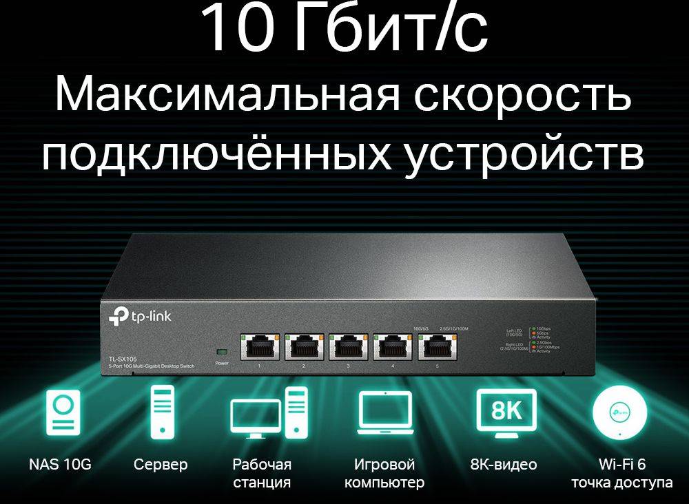 ОсобенностиПять портов 10 Гбит/с. Высокоскоростные подключения для NAS?устройств 10G, серверов 10G, игровых компьютеров, Wi?Fi 6 точек доступа 2.5G/5G/10G, 8K?видео и не только. Бесшумная работа. Тихая работа благодаря продуманной конструкции. Plug and Play. Простая установка без помощи специалиста.