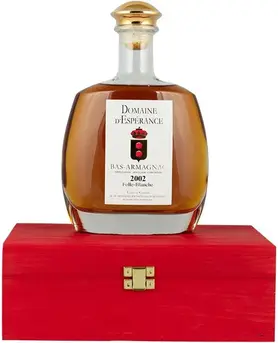 Domaine d'Esperance, Bas-Armagnac Folle Blanche, 2002 — очень редкий арманьяк бочковой крепости. Напиток производится по классической технологии и выдерживается в дубовых бочках минимум 13-15 лет. Виноград сорта Фоль Бланш, из которого создан этот арманьяк, выращивается в апелласьоне Ба-Арманьяк и является традиционным арманьячным сортом во французской провинции. Фоль Бланш придает изысканное цветочное благоухание и обволакивающую мягкость вкусу напитка. Многие известные коньячные дома используют именно этот сорт в основе своих композиций. Дистилляция спиртов проходит в специальных арманьячных аламбиках. Бленд арманьячных спиртов выдерживается сначала в новых бочках, а затем в старых бочках из черного гасконского дуба. Созревание в бочке требует высокой квалификации и неусыпного контроля над балансом: дубовые ноты могут с легкостью взять верх над нежным, утонченным Фоль Бланш.