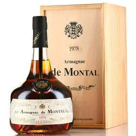 Арманьяк de Montal Bas Armagnac 1978 г. — французский сорокаградусный напиток защищенного географического наименования из провинции Гасконь, созданный в апелласьоне Нижний Арманьяк из разрешенных местных сортов винограда. Ягоды были собраны вручную в один урожайный год на плантациях, сложенных глиной и кремнием. Их подвергли сортировке, ферментации и непрерывной перегонке в трех медных аутентичных колоннах. Вызревание осуществилось в больших барриках из древесины французского белого дуба (вместимость 400 л) и продлилось несколько десятилетий. Арманьяк в стеклянных бутылках комплектуется сувенирными деревянными боксами в классическом стиле.