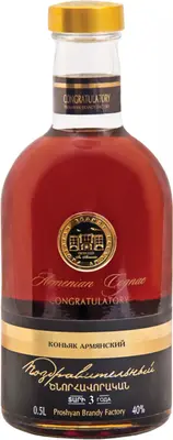Коньяк "Congratulatory" 3 Years Old прошел трехлетнюю выдержку в бочонках из черного карабахского дуба. Виноград для него был выращен на собственных плантациях Прошянского завода, без добавления химических удобрений и пестицидов. Готовый напиток покоряет объемным ароматом, в котором прослеживаются фруктовые оттенки, и богатым вкусом с шоколадно-сливочным характером. Коньяк "Поздравительный" 3-летний хорош как в самостоятельном виде, так и в паре с закусками.