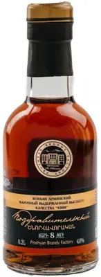 Коньяк "Congratulatory" 8 Years Old прошел восьмилетнюю выдержку в бочонках из черного карабахского дуба. Виноград для него был выращен на собственных плантациях Прошянского завода, без добавления химических удобрений и пестицидов. Готовый напиток покоряет приятным и гармоничным ароматом и богатым вкусом с шоколадно-сливочным характером и приятной жгучестью. Коньяк "Поздравительный" 8-летний хорош как в самостоятельном виде, так и в паре с закусками.