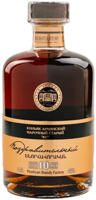 Коньяк "Congratulatory" 10 Years Old прошел 10-летнюю выдержку в бочонках из черного карабахского дуба. Виноград для него был выращен на собственных плантациях Прошянского завода, без добавления химических удобрений и пестицидов. Готовый напиток покоряет приятным и гармоничным ароматом и богатым вкусом с шоколадно-сливочным характером и приятной жгучестью. Коньяк "Поздравительный" 10-летний хорош как в самостоятельном виде, так и в паре с закусками.