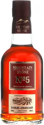 Высококачественный коньяк "Mountais & Stone" №5 произведен на основе старейших традиционных рецептов из армянских коньячных дистиллятов, выдержанных от четырех до пяти (и более) лет. Дистилляты изготавливаются исключительно из винограда местных сортов, выращенного в Араратской долине. Для выдержки коньяка используются бочки из кавказского дуба, произрастающего на территории Армении. Название коньяков "Горы и Камни" указывает на классический армянский рельеф, недаром армяне называют свою родину "Страна камней" и говорят, что в Армении нет горизонта, а кругом — одни горы.