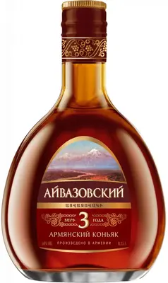 Элегантный коньяк "Айвазовский" 3-летний изготовлен по традиционному армянскому рецепту и обладает характерным, классическим вкусом коньяков Араратской Долины. Коньяк назван в честь художника-мариниста, Ивана Константиновича Айвазовского. Выдержка коньяка проводится в дубовых бочках и длится 3 года. Коньяк рекомендуется употреблять в чистом виде, а также сочетать с мясными деликатесами, рыбой, сырами, десертами и спелыми абрикосами, добавлять в коктейли или кофе.