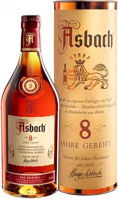"Asbach" Privatbrand 8 Jahre — популярный немецкий бренди, обладающий неповторимым янтарным цветом, душистым ароматом и округлым, насыщенным пряным вкусом, которые делают его уникальным. Хуго Асбах создал рецепт этого благородного напитка в 1908 году. Бренди изготавливается из отборных вин из лучших винодельческих регионов, выдержка бренди в небольших бочках из лимузенского дуба длится не менее 8 лет.
