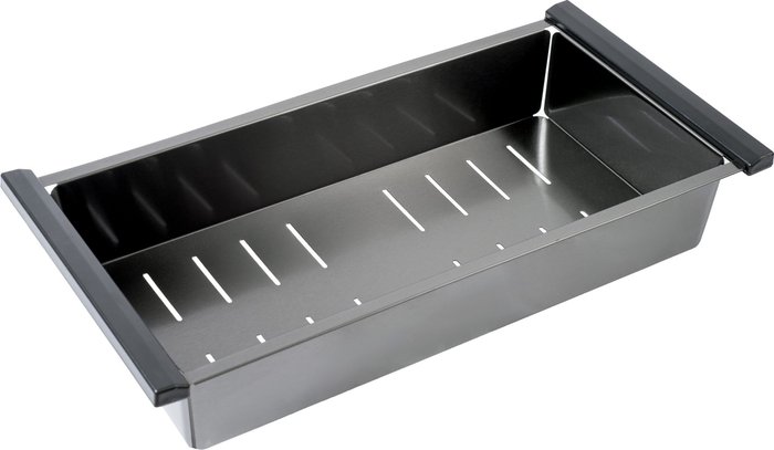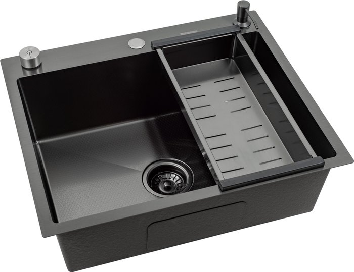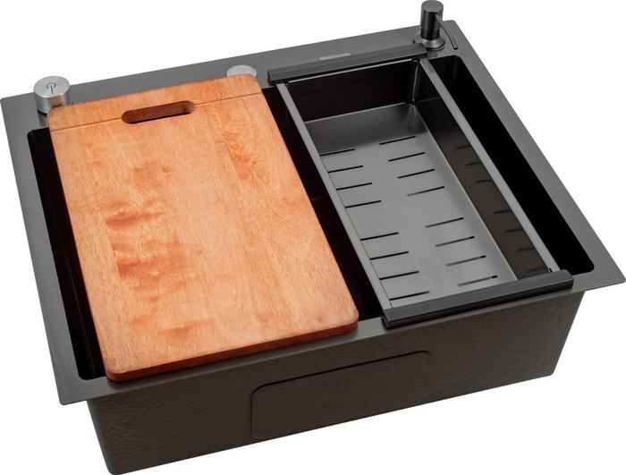 КомплектацияПолуавтоматический сифон Pop up, коландер (pvd Графит), гофра, дозатор для моющего средства (pvd Графит), мойка (pvd Графит), разделочная доска