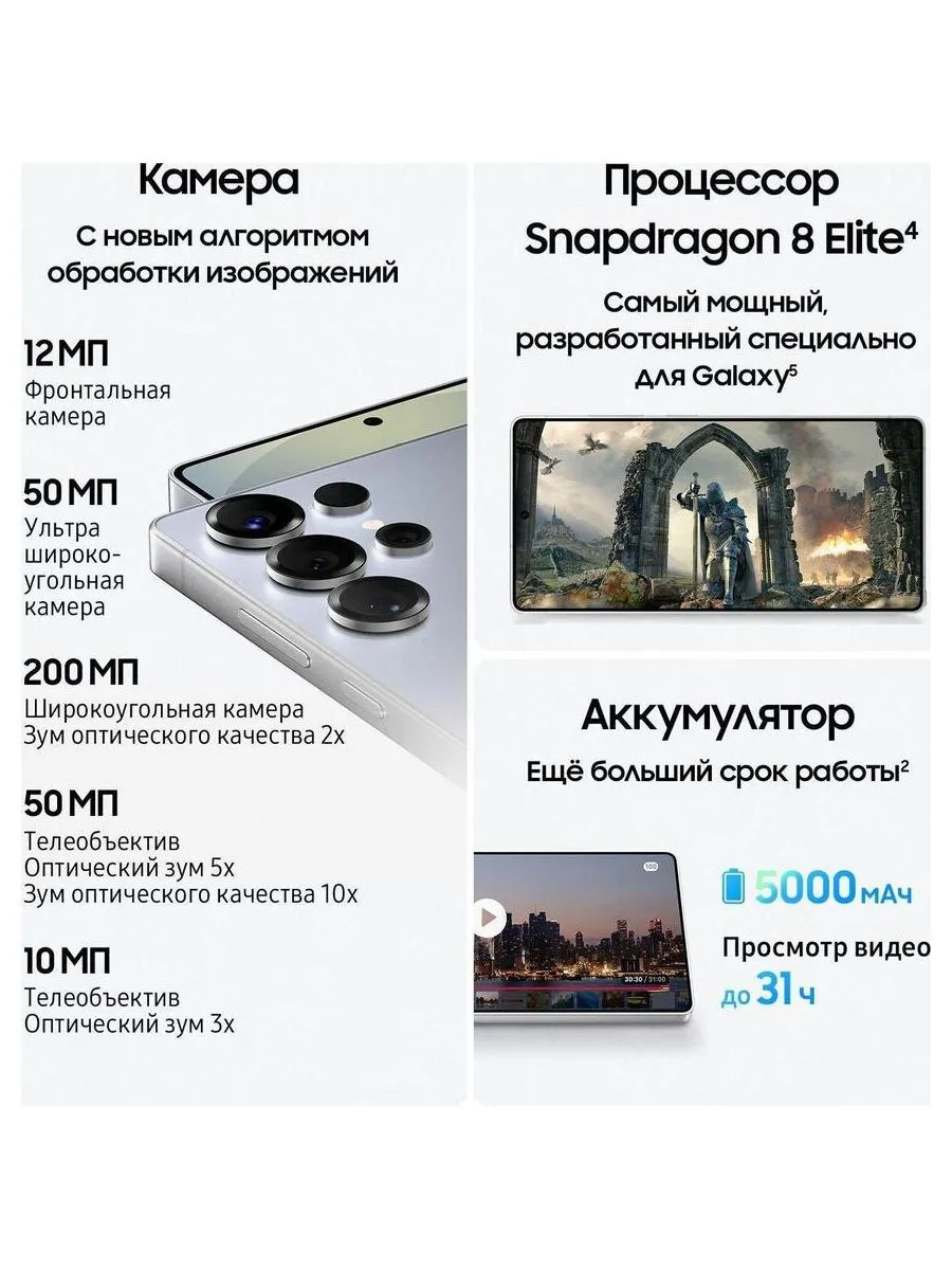 Смартфон Samsung Galaxy S25 Ultra сочетает в себе премиальный дизайн и передовые технологии для создания профессиональных фотографий и упрощения повседневных задач благодаря искусственному интеллекту Galaxy AI. «Синхронный перевод» перевод звонков в реальном времени, чтобы вы могли общаться на любом языке без барьеров. «Умный редактор» позволяет перемещать и удалять объекты на фото. «Обвести и найти» – дополнительный способ искать информацию, музыку, переводить текст и даже решать задачи с помощью обведения объектов на фото. «Генератор текста» быстро создает тексты на любую заданную тему – легко и удобно. Основная камера 200 Мп захватывающая детализация и глубина изображения. Дополнительные объективы: 50 Мп (ультра-широкоугольный), 50 Мп и 10 Мп (телефото) для съемки на любом расстоянии. Фронтальная камера 12 Мп идеально подходит для четких и естественных селфи. ToF-камера с лазерным автофокусом для точной фокусировки даже в условиях низкой освещенности. Процессор Snapdragon 8 Elite с поддержкой трассировки лучей для реалистичного игрового опыта. Емкость аккумулятора 5000 мА·ч для длительного времени автономной работы. Экран 6.9 Dynamic AMOLED 2X с адаптивной частотой обновления до 120 Гц для невероятно плавной графики. Улучшенная система охлаждения позволяет устройству оставаться холодным даже при интенсивных нагрузках. Samsung Galaxy S25 Ultra – создавайте, играйте и работайте с комфортом и максимальной производительностью.