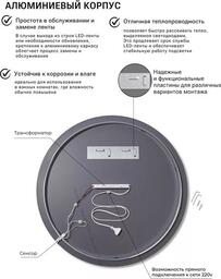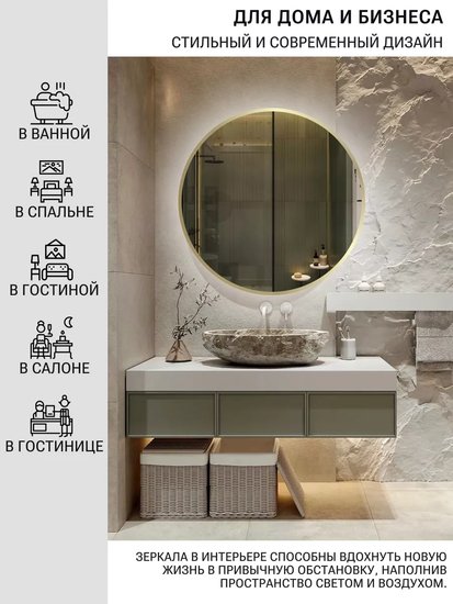 ✅ Круглое зеркало на стену в стильной раме – идеальное решение для тех, кто хочет добавить уникальности в интерьер. Дневная белая подсветка (4000К) создает комфортное освещение, которое приятно воспринимается глазом.✅ Сенсорное включение на движение позволяет легко управлять освещением, просто сделав взмах рукой. Это зеркало станет отличным дополнением для прихожей, спальни, гостиной, детской или коридора, наполняя пространство уютом и светом.✅ Изготовлено из влагостойкого полотна со шлифованной кромкой, что делает его безопасным и удобным в использовании. Это зеркало можно устанавливать в помещениях с повышенной влажностью, таких как ванная комната, душевая кабина, баня или туалет.✅ Матовая окантовка шириной 10 мм выполнена методом УФ-печати с использованием экологически чистых чернил, что гарантирует отсутствие вредных примесей и устойчивость к влаге. ✅ Декоративное светящееся зеркало комплектуется прочными крепежами и готово к самостоятельному монтажу, что делает его установку простой и быстрой. ⚠️ Не упустите возможность преобразить ваше пространство с помощью этого стильного зеркала!✅ Круглое зеркало на стену в стильной раме – идеальное решение для тех, кто хочет добавить уникальности в интерьер. Дневная белая подсветка (4000К) создает комфортное освещение, которое приятно воспринимается глазом.✅ Сенсорное включение на движение позволяет легко управлять освещением, просто сделав взмах рукой. Это зеркало станет отличным дополнением для прихожей, спальни, гостиной, детской или коридора, наполняя пространство уютом и светом.✅ Изготовлено из влагостойкого полотна со шлифованной кромкой, что делает его безопасным и удобным в использовании. Это зеркало можно устанавливать в помещениях с повышенной влажностью, таких как ванная комната, душевая кабина, баня или туалет.✅ Матовая окантовка шириной 10 мм выполнена методом УФ-печати с использованием экологически чистых чернил, что гарантирует отсутствие вредных примесей и устойчивость к влаге. ✅ Декоративное светящееся зеркало комплектуется прочными крепежами и готово к самостоятельному монтажу, что делает его установку простой и быстрой. ⚠️ Не упустите возможность преобразить ваше пространство с помощью этого стильного зеркала!