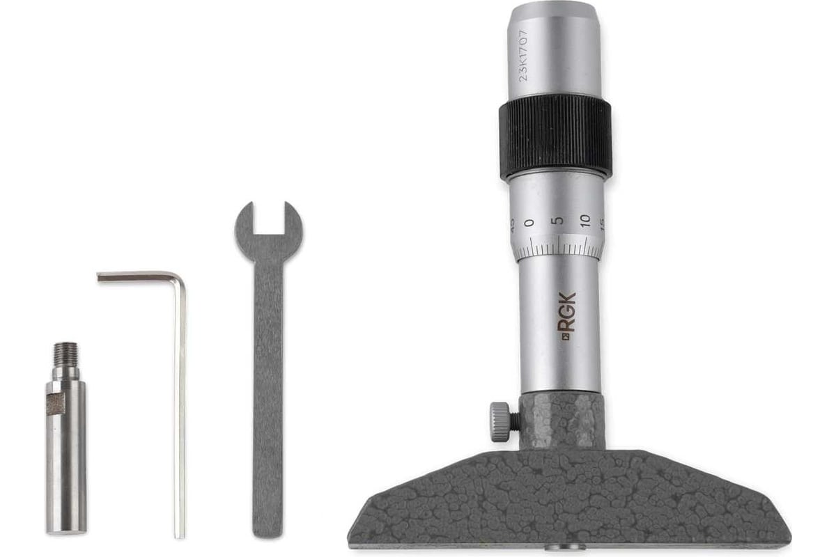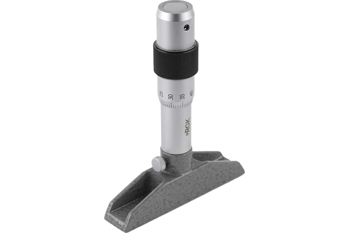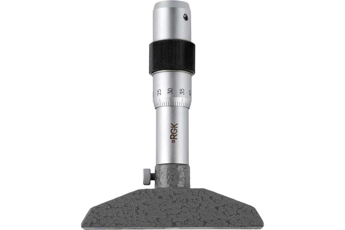 Глубиномер микрометрический RGK GM-50 предназначен для высокоточного контроля геометрических параметров различных изделий, обеспечивая определение высоты выступов и глубины отверстий, углублений и выемок относительно опорной поверхности. Изготовленный в таком же конструкционном исполнении, как младшая модель серии, прибор снабжен дополнительным измерительным стержнем калиброванной длины с винтовым креплением, что позволяет выполнять замеры в диапазоне не только 0 - 25 мм, но и 25 - 50 мм.