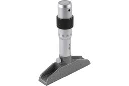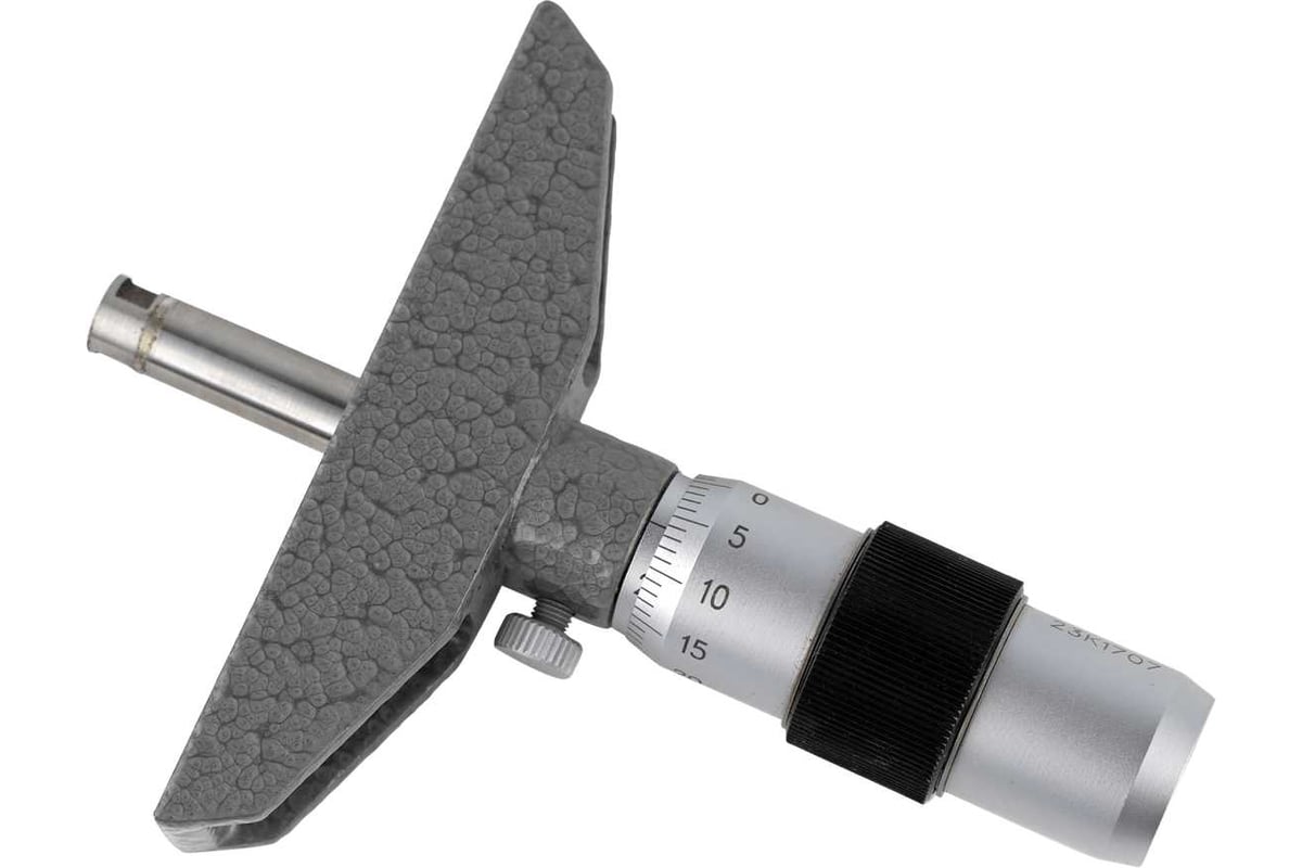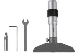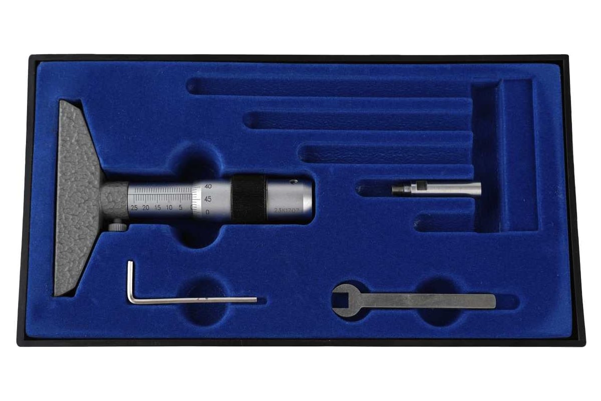 Шкала микрометрического глубиномера с отчетливыми гравированными отметками на стебле и барабане позволяет считывать показания с погрешностью не более ±4 мкм. Плоские твердосплавные поверхности измерительных стержней, обработанные методом высокоточного шлифования, характеризуются улучшенной износостойкостью. Стопорный винт в основании дает возможность фиксировать вылет микрометрического винта при считывании показаний или при перенастройке измерителя, либо при снятии и установке сменных элементов. В комплект поставки включены ключи для замены стержней и выставки начального положения шкалы барабана, а также жесткий футляр для хранения и переноски инструмента.