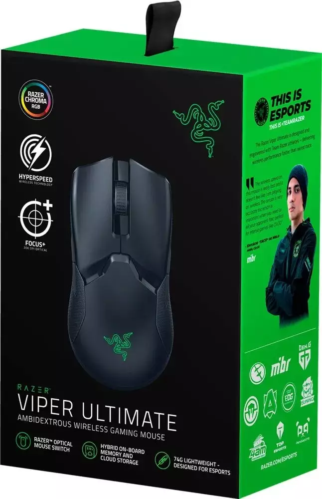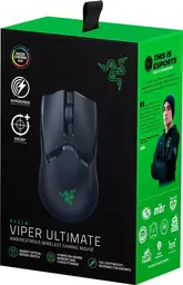 КомплектацияИгровая мышь Razer Viper Ultimate, Беспроводной USB передатчик 2,4 ГГц (хранится внутри мышки), Адаптер для беспроводного USB передатчика, Кабель для зарядки, Важная информация о продукте.