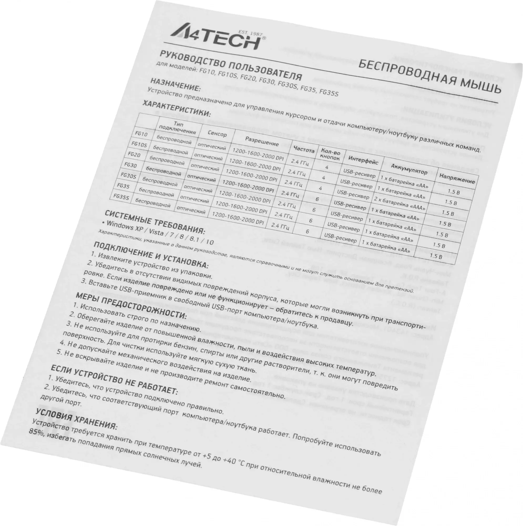 • Радиус действия мыши 10 м