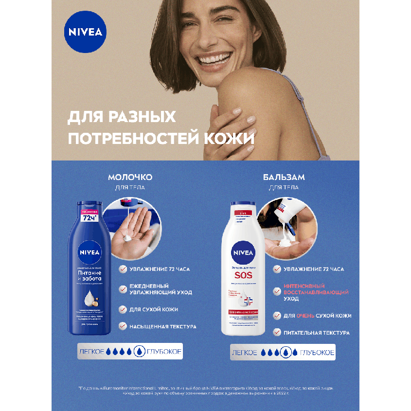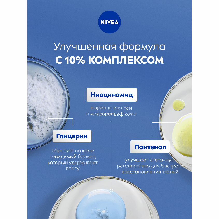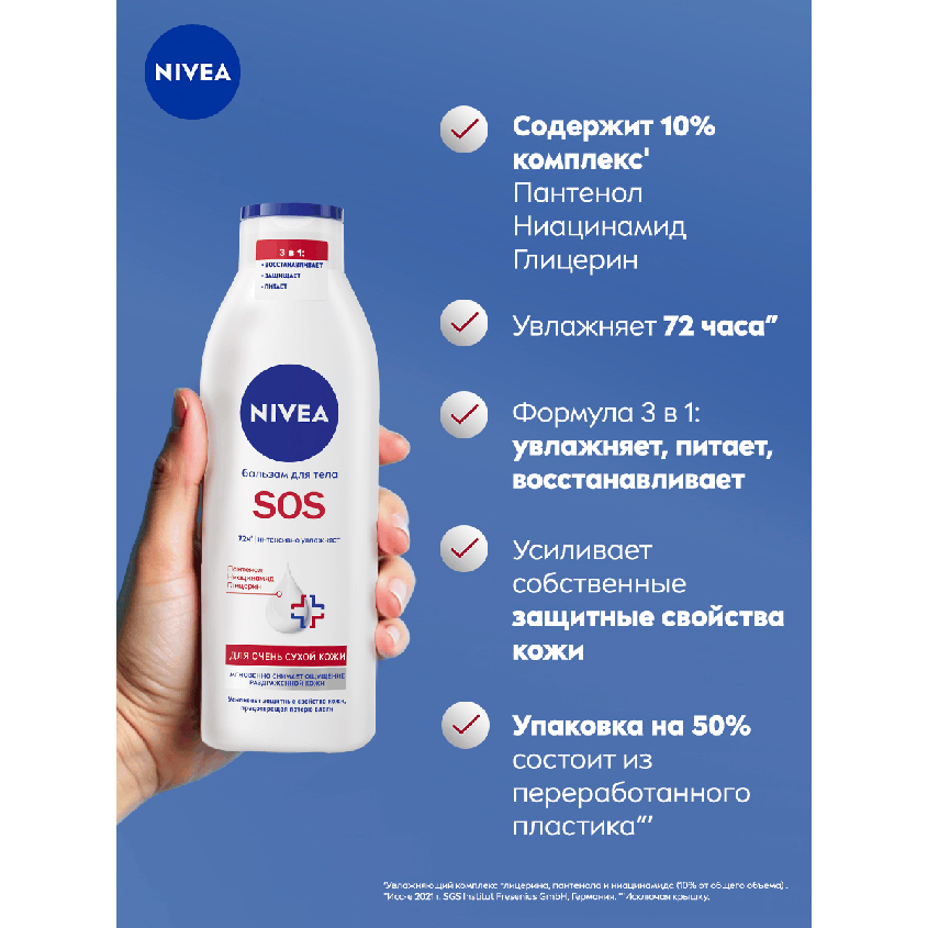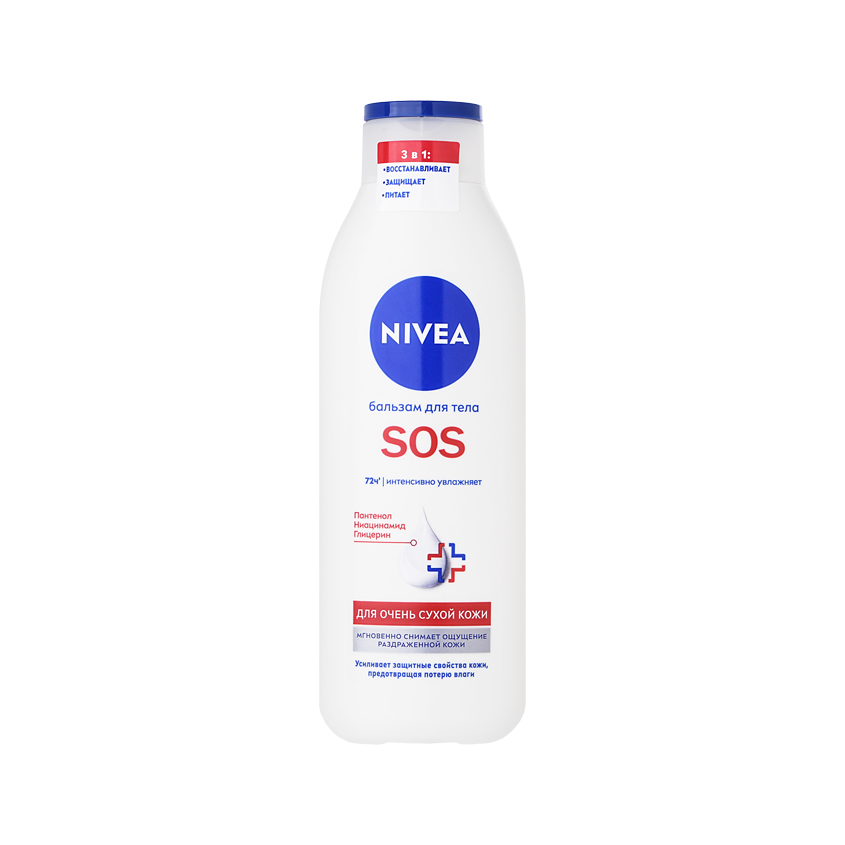 Бальзам для тела “SOS” от NIVEA обеспечивает глубокое увлажнение кожи тела на 72 часа'. Улучшенная формула* с Пантенолом, Ниацинамидом и Глицерином мгновенно успокаивает, снимает ощущение раздраженной кожи, обеспечивая комплексный уход. Бальзам усиливает способность кожи удерживать влагу. Средство обладает нежирной текстурой и быстро впитывается. Дерматологически протестировано.