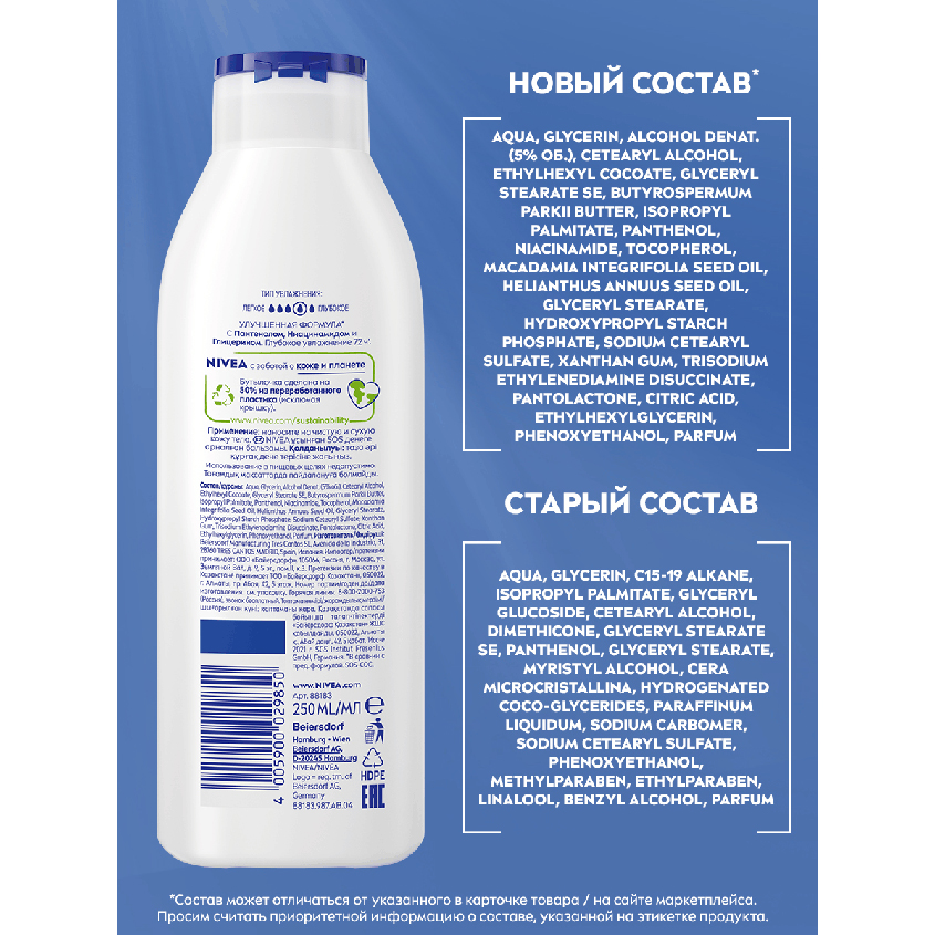 Бренд NIVEA заботится о коже и планете, поэтому бутылочка сделана на 50% из переработанного пластика (исключая крышку).
