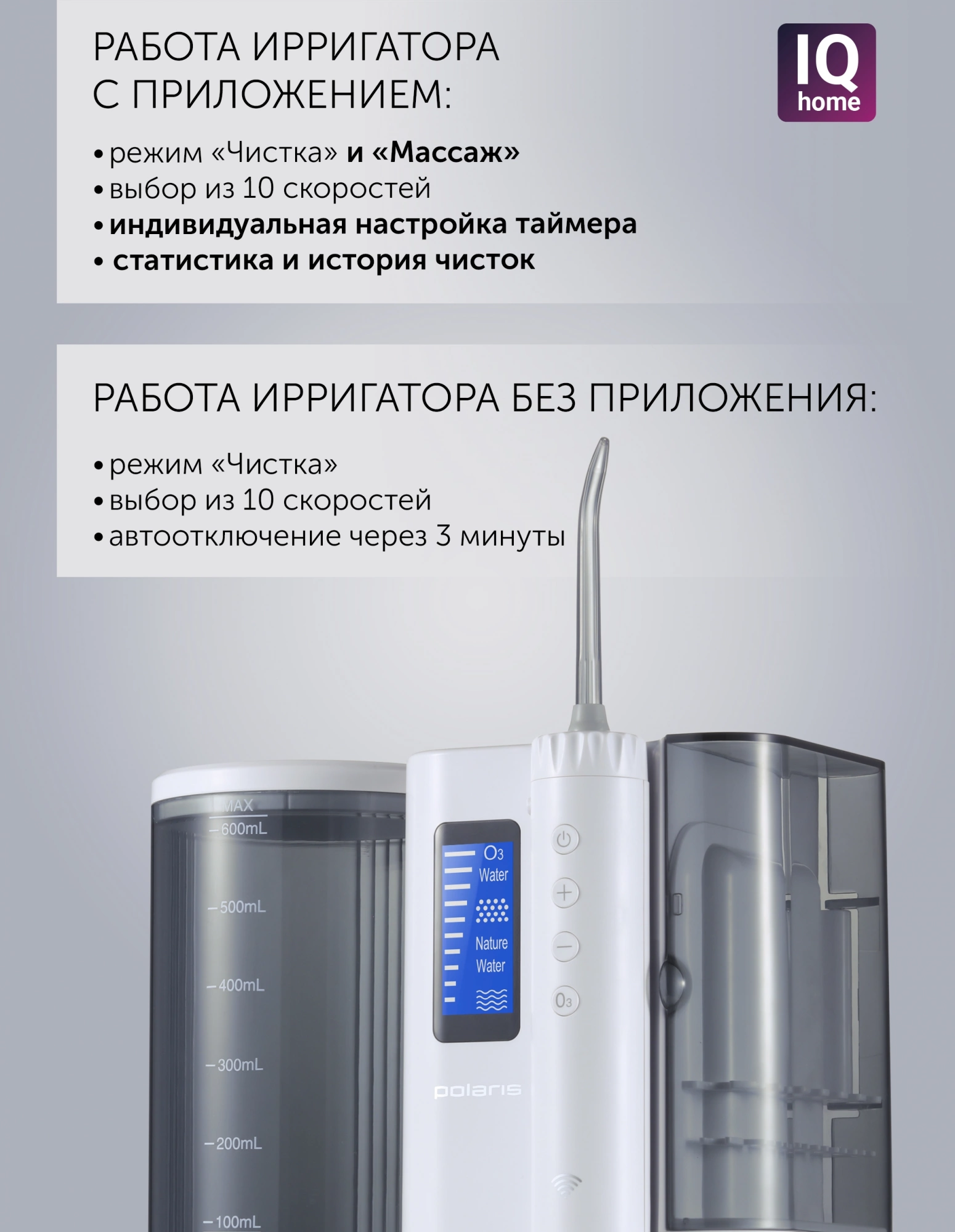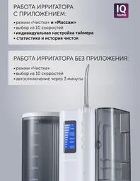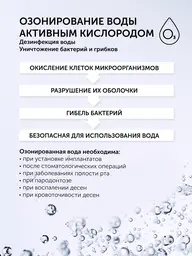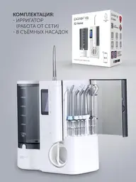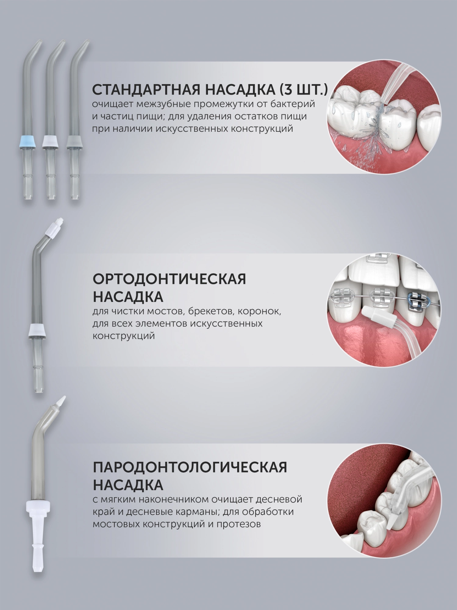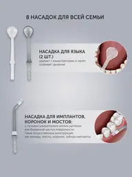 Особенностичистка межзубных промежутков, удаление налета напором воды в дополнение к зубной щетке; соблюдение гигиены при наличии имплантов, брекетов, коронок, мостов; для оздоровления десен с помощью массажа; озонирование воды: дополнительная дезинфекция воды; способствует снятию воспаления с десен