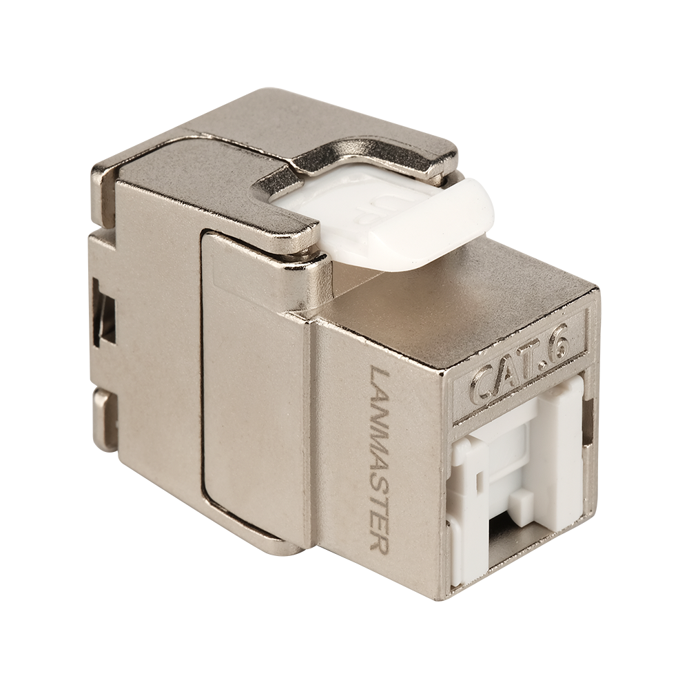Модуль может использоваться для комплектации экранированных телекоммуникационных розеток, устанавливаемых в короб, на стену, в стену, а также для установки в наборные патч-панели (см. совместимые товары).Соответствует требованиям категории 6.Модуль имеет стандартный типоразмер Keystone и может использоваться не только в розетках LANMASTER, но и в розетках других производителей.На лицевой стороне модуля смонтировано экранированное восьмиконтактное гнездо типа RJ-45, с обратной стороны установлен блок на восемь контактов типа IDC110, расположенных под углом 180° к лицевой поверхности модуля.Непрерывность экрана обеспечивается стягиванием половинок крышки.Для подключения кабелей используется способ врезного контакта сквозь изоляцию - IDC. Для удобства монтажа, на крышке модуля расположена схема подключения проводников кабеля, в соответствии со схемами T568A и T568B. Кабель раскладывается в пазы на крышке модуля, излишки обрезаются. При защелкивании половинок крышки корпуса, контакты прорезают изоляцию проводника. Таким образом, подключаемый кабель легко монтируется без использования инструмента. Модуль имеет встроенную шторку, автоматически утапливаемую при подключении к модулю патч-корда. Шторка защищает контакты модуля от попадания пыли, грязи и механических повреждений при использовании модуля в наборных панелях или с лицевыми вставками, не имеющими своих защитных шторок.